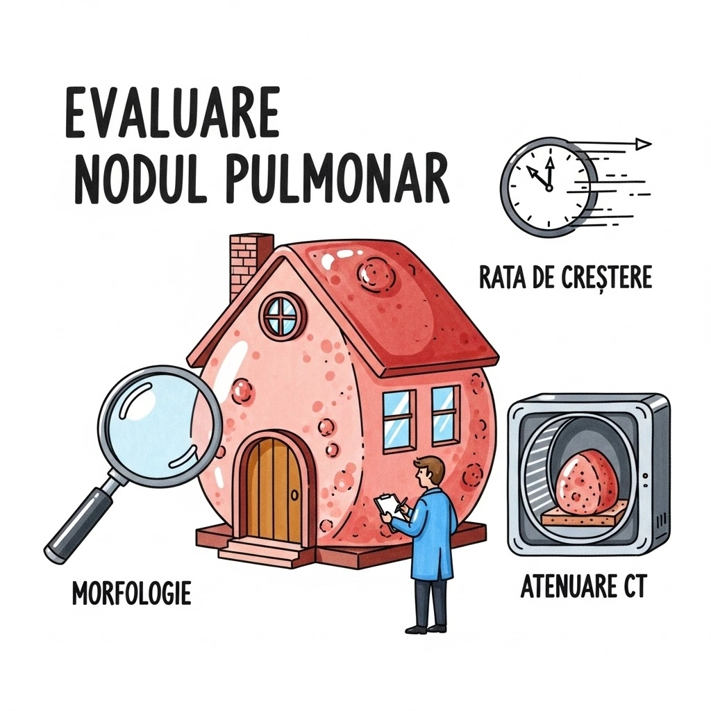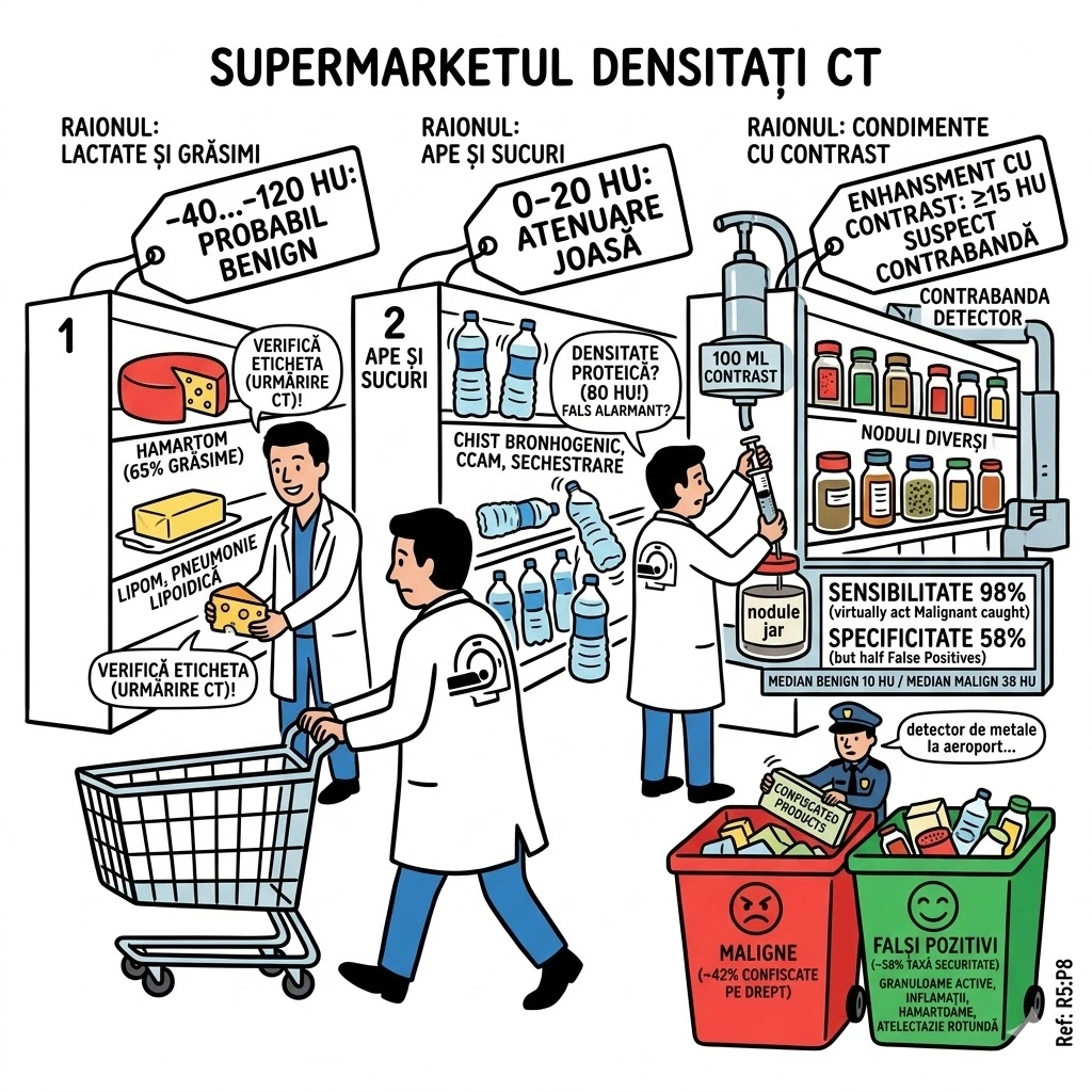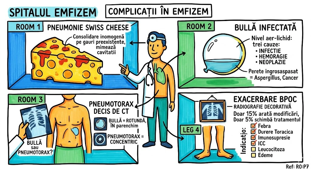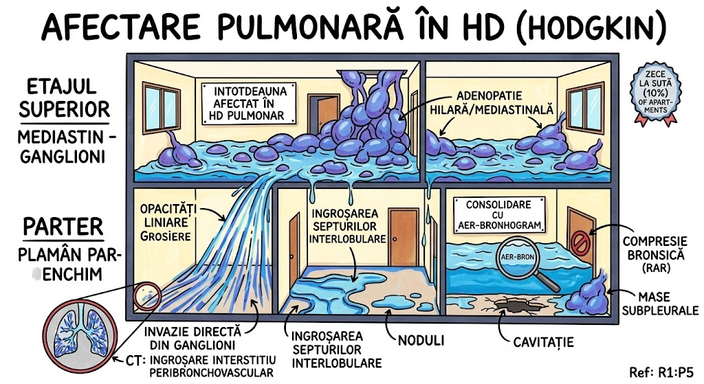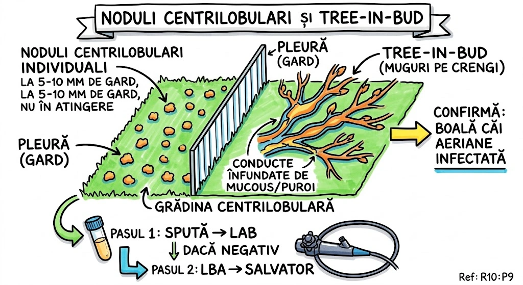 O casa cu noua camere, fiecare cu o problema specifica de renovare. Camera 1 (Sufrageria opaca): peretii vopsiti complet in alb — vasele (cablurile electrice) nu se mai vad. Camera 2 (Coridorul aerisit): singurele conducte vizibile in toata casa alba sunt cele de aer — bronhograma aeriana. Camera 3 (Pereti cetosi): marginile camerelor sunt estompate, neclare. Camera 4 (Bule sub tapet): mici pete de aer ramase captive — air alveolograms. Camera 5 (Pete de umezeala): consolidare variabila, opacitati in pete. Camera 6 (Bile de mortar): granulatii rotunde prost delimitate, 5–10 mm, distributie centrilobulara — nodulii acinari. Camera 7 (Volumul casei neschimbat): volumul se pastreaza. Camera 8 (Umezeala la pereti exteriori): procesul ajunge pana la pleura. Camera 9 (Teava prin ciment): dupa contrast IV, vasele stralucesc mai puternic decat parenchimul consolidat — semnul CT angiograma. Nota: daca nu vezi tubulatura de ventilatie in coridor (bronhograma absenta), cineva a blocat intrarea — obstructie centrala probabila.