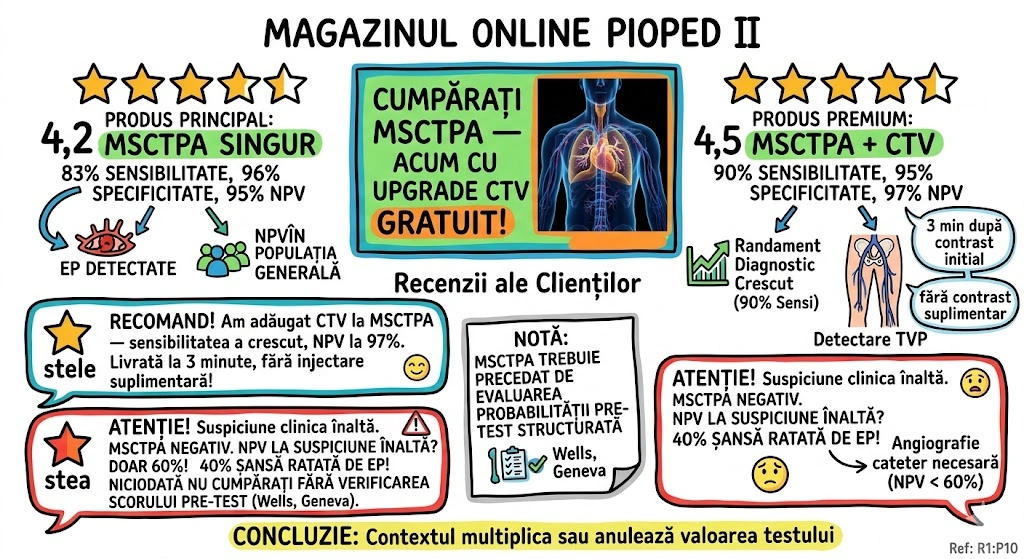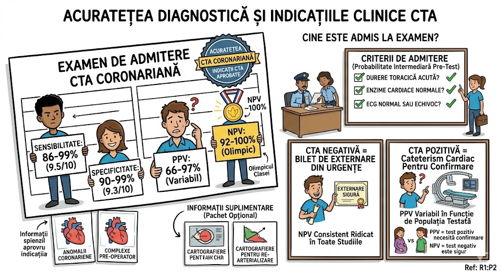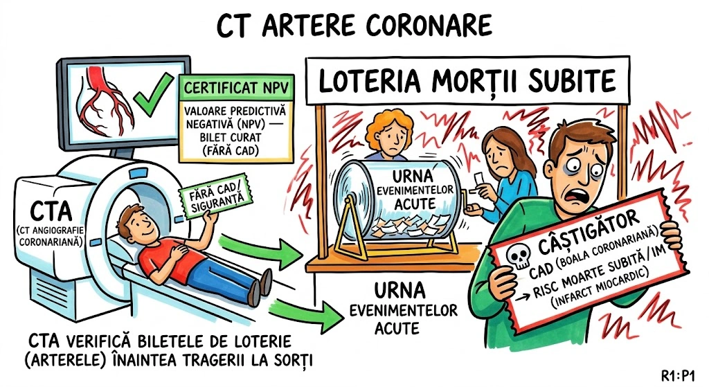 PPV de 66-97% vs. NPV de 92-100% e ca diferenta dintre un test de sarcina si un test de virgitate: testul negativ e aproape sigur corect (NPV), dar testul pozitiv necesita confirmare (PPV variabil). In practica: CTA negativa = pacientul pleaca acasa linistit. CTA pozitiva = pacientul merge la cateterism pentru verdictul final.