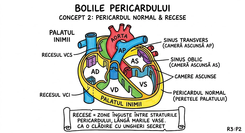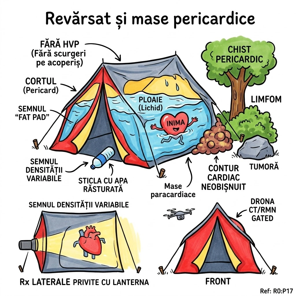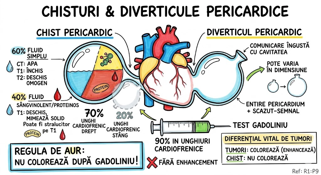 La petrecerea de dezvoltare embrionara, cineva a uitat doua tipuri de baloane lipite de colturile inimii. Balonul sigilat (chistul) sta in 90% din cazuri in unghiurile cardiofrenice — 70% in coltul drept, 20% in stang. Nu are nicio legatura cu interiorul pericardului. Balonul cu robinet (diverticulul) comunica ingust cu cavitatea si poate creste sau scadea dupa nivelul lichidului. 60% din baloane contin apa limpede (T1 inchis, T2 deschis). 40% — atentie — contin lichid proteinos sau sangvinolent, si pe T1 stralucesc. Un radiolog neatent vede ceva stralucitor pe T1 in unghi cardiofrenic si striga "tumora!" Dar baloanele nu se coloreaza dupa gadoliniu. Tumorile — da. Acesta e testul. "Ai pus gadoliniu?" "Da." "Se coloreaza?" "Nu." "E balon, nu tumora. Mergi acasa."