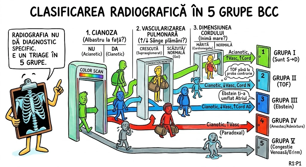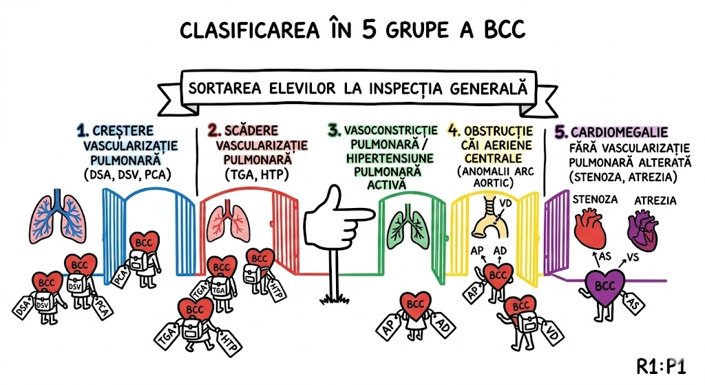 CHD acianogena cu sunt Stg→Dr vs. cianogena cu AP scazuta e ca diferenta dintre o cada care se umple prea repede (supraincarcare volum pulmonar — Qp/Qs >1) vs. o cada care nu primeste destula apa (flux pulmonar redus — VD hipertrofiat, cianoza). Ambele sunt probleme de debit — una in exces, cealalta in deficit. TGA si truncusul sunt la mijloc: apa ajunge, dar e amestecata cu apa murdara.