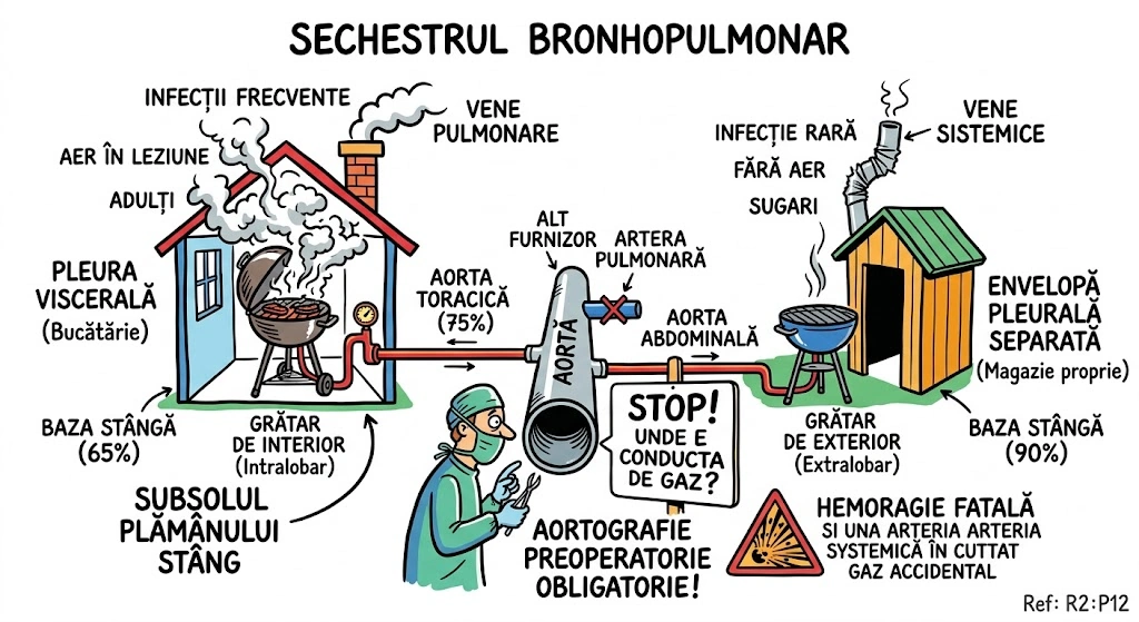 🥊 Ringul Comparatiilor: Sechestrul intralobar e ca un gratar montat ilegal in bucataria unui apartament — si fumul iese pe cosul blocului (vene pulmonare). Sechestrul extralobar e ca un gratar in garajul propriu — separat de casa, cu cos propriu (vene sistemice). Ambele folosesc gaz de la alt furnizor (aorta, nu artera pulmonara) — asta le diferentiaza de CCAM (p6) care foloseste furnizorul normal (artera pulmonara) dar are camera in dezordine.