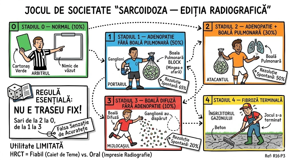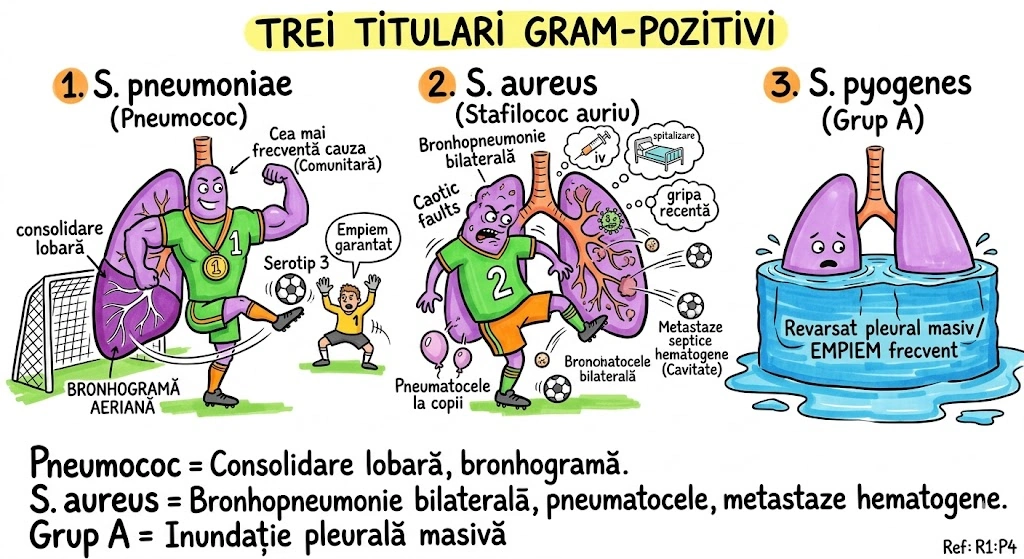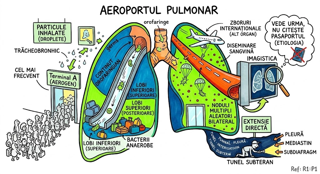 Tabloul de scor de pe stadionul pulmonar. Antrenorul Pneumococ prefera atac lobar clasic — un singur lob, ocupat complet. Antrenorul Klebsiella e mai agresiv — ocupa lobul si il expandeaza pana scizurile se bombeaza sub presiune. Carcinomul bronhiolo-alveolar joaca diferit — atac rotund, izolat, misterios, confundabil cu o minge uitata pe teren. Embolia cu infarct ataca pe coridor segmentar — un singur segment, forma de pana cu baza pleurala. Si cronometrul conteaza: gol inscris in minute-ore → edem, aspiratie, hemoragie. Meci care dureaza 4–6 saptamani → e meci cronic: eozinofilica, BOOP sau neoplasm.