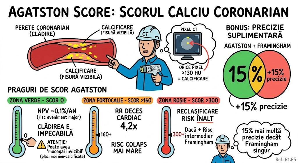 Scorul Agatston zero care totusi nu exclude placile moi e ca o inspectie de casa care gaseste peretii curati dar nu verifica instalatia ascunsa. Peretii arata bine (zero calcificari), dar tevile din spate (placile non-calcificate) pot fi corodate. Probabilitatea unei leziuni obstructive e foarte mica — dar nu zero.