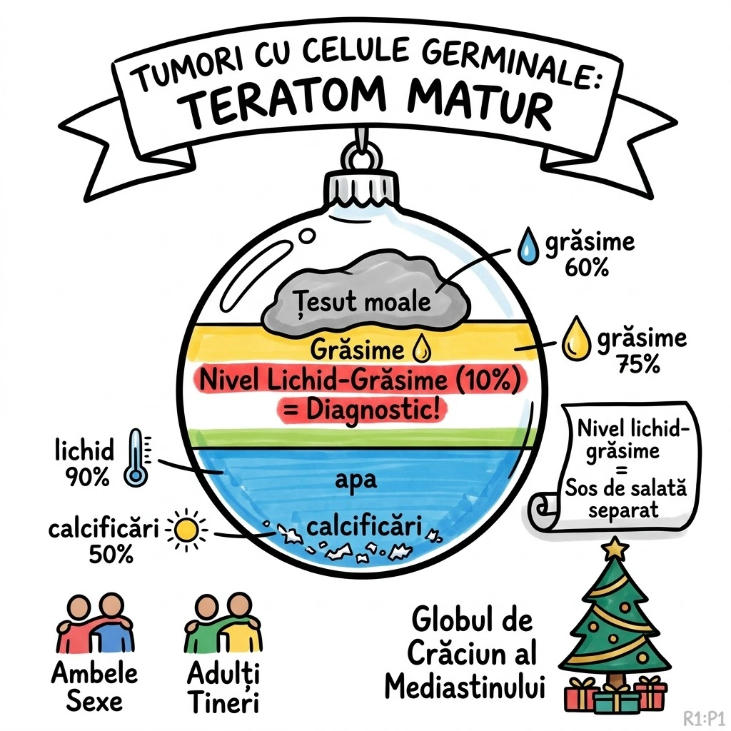 Pivnita Plamanului, raftul Lobilor Inferiori: un borcan rotund, perfect sigilat, sta acolo de la constructia casei (gestatie). Jumatate din borcane contin lichid clar (0-20 HU) — nu deranjeaza pe nimeni. Dar cealalta jumatate contine un continut dens, proteic, cu aspect de gem inchis (40-80 HU) — radiologul se uita si zice: "Pare masa solida." Nu e. E borcan cu gem vechi. In 75% din cazuri, borcanul se infecteaza: se umfla, capacul sare partial (aer intrachistic), apare un nivel apa-gem (nivel aer-lichid). Peretele borcanului e atat de subtire incat pe CT e invizibil — ca un Tupperware medical din gestatie, cu eticheta lipsa si continut surpriza.