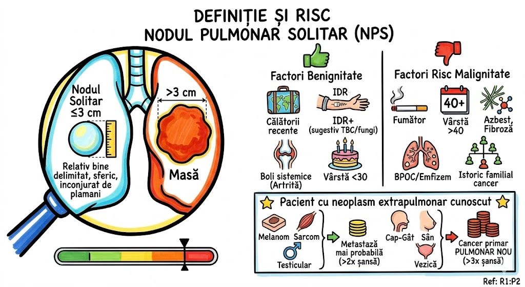 Ce Memoram: Sechestr = portiune de parenchim pulmonar dezorganizat, fara comunicare normala cu arborele bronsic sau AP, alimentat din aorta. Doua tipuri: Intralobar (mai frecvent; in interiorul pleurei viscerale; 65% baza stanga; alimentare din aorta toracica 75%; drenaj in vene pulmonare; adulti; infectie frecventa; aer in leziune frecvent) vs. Extralobar (mai rar; in propria envelopa pleurala; 90% baza stanga; alimentare din aorta abdominala; drenaj in vene sistemice; sugari; infectie rara; aer rar). ATENTIE: aortografia preoperatorie obligatorie — hemoragie fatala daca arterele sistemice sunt sectionate accidental.