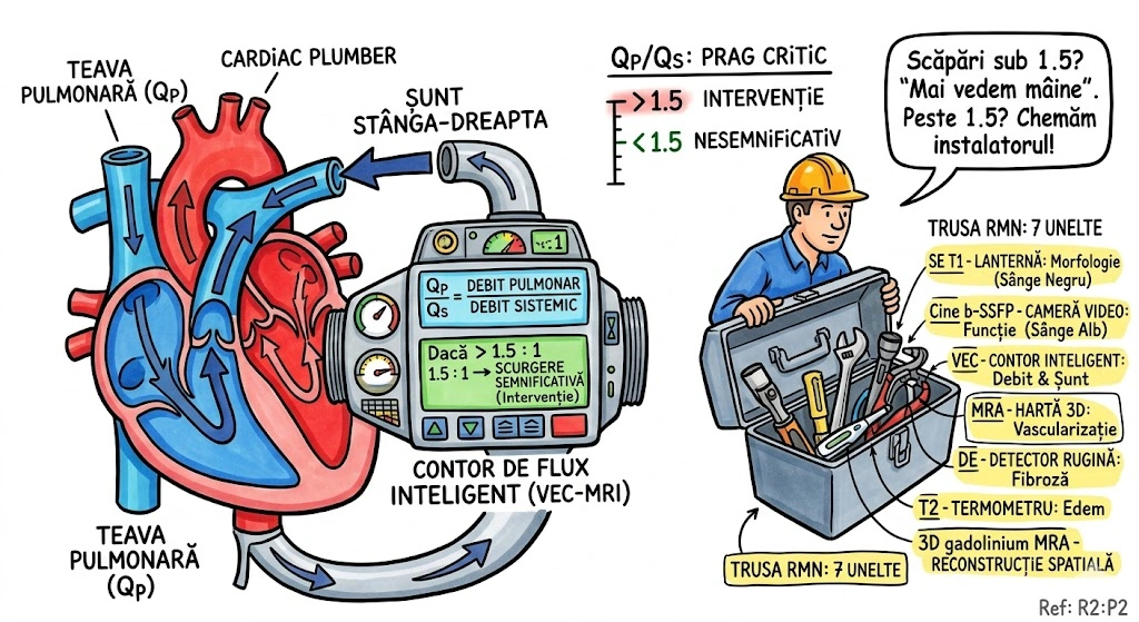 VEC-MRI fata de ecocardiografia Doppler e ca diferenta dintre a masura debitul de apa cu un contor digital calibrat vs. a-l estima dupa zgomotul din teava: Doppler-ul depinde de fereastra acustica si de unghiul de insonatie (daca tinii stetoscopul stramb, auzi gresit), pe cand VEC-MRI masoara direct, precis si reproductibil, indiferent de habitusul pacientului.