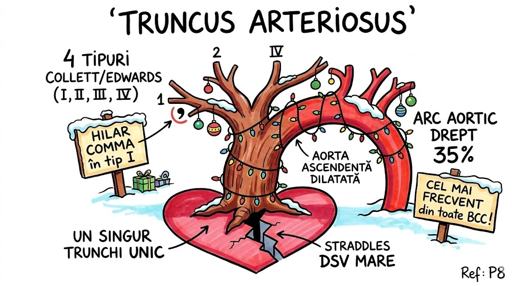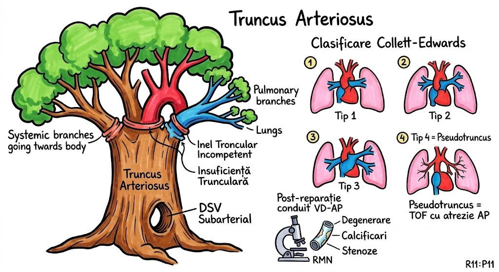 Truncus arteriosus vs. TOF e ca diferenta dintre un copac care s-a nascut cu un singur trunchi (truncus — o singura iesire) vs. un copac cu doua tulpini unde una e partial blocata (TOF — obstructie tract ejectie VD). In TOF, tulpina pulmonara exista dar e ingustata. In truncus, tulpina pulmonara nu exista separat — totul pleaca din acelasi loc. Tip 4 de truncus e de fapt un TOF deghizat (atrezie pulmonara completa cu colaterale).
