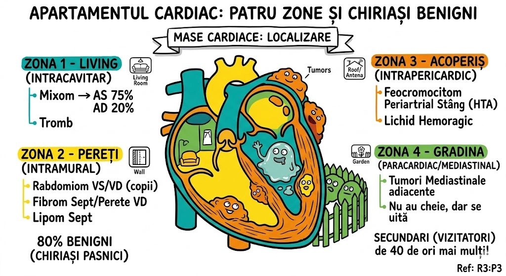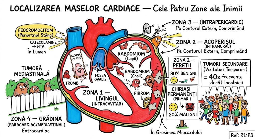 Inima ca un apartament cu patru zone distincte, si fiecare tumora e un chirias cu preferinta clara pentru o anumita camera. Zona 1 — Livingul (Intracavitar): spatiul din interiorul camerelor cardiace, acolo unde stau mixoamele, trombii si alte mase care plutesc in sange. Zona 2 — Peretii (Intramural): grosimea peretilor miocardici, unde se ascund rabdomioamele si fibroamele — nu le vezi de pe coridor, trebuie sa spargi tencuiala. Zona 3 — Acoperisul (Intrapericardic): pe conturul extern al pericardului — feocromocitoamele stau ca antenele de satelit puse pe acoperis fara autorizatie. Zona 4 — Gradina (Paracardiac/Mediastinal): extracardiac dar adiacent — tumori mediastinale care se invecineaza cu inima. In acest apartament, 80% din chiriasii permanenti (tumorile primare) sunt pasnici (benigni). Dar vizitatorii temporari (tumorile secundare) sunt de 40 de ori mai numerosi.