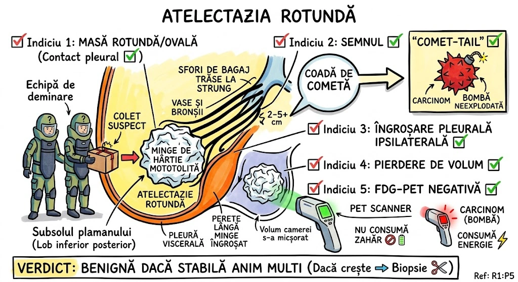 Gandeste-te la un burete de bucatarie. Buretelui (plamanul) i se pot intampla doua lucruri rele: fie il imbiba cineva cu apa, ulei sau sos (consolidare — structura ramane, aerul e inlocuit cu altceva), fie il storci si il comprimi sub o oala grea (atelectazie — pierde volum, se face mic si dens). Pe radiografie ambele arata ca o „pata alba" — trucul e sa intelegi daca buretelui i s-a schimbat continutul sau i s-a schimbat dimensiunea. Instrumentele de investigatie: Rx (PA/AP/lateral), CT si HRCT.