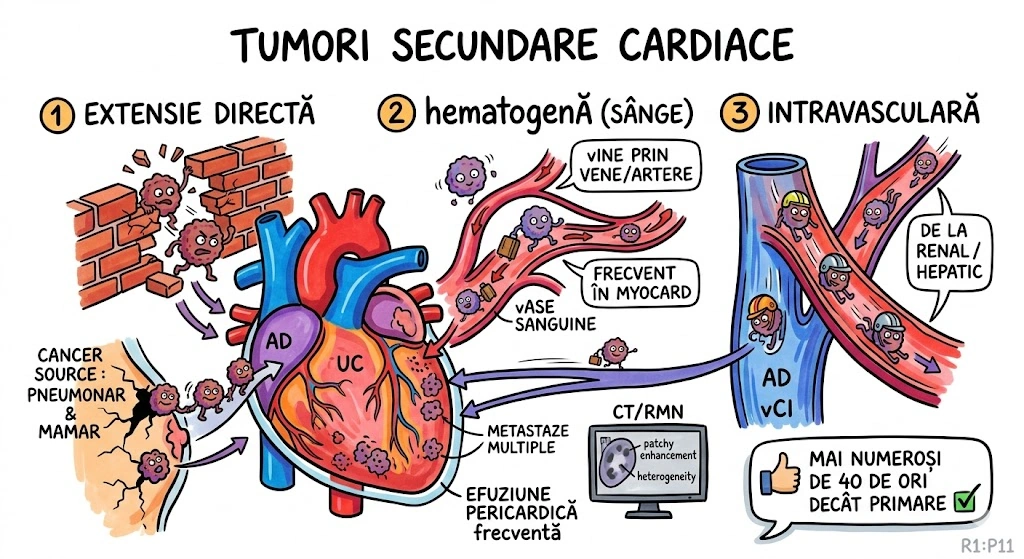 Tumorile secundare ale inimii si pericardului sunt de aproximativ 40 de ori mai frecvente decat tumorile primare. Trei cai de diseminare: (1) extensie directa din tumori intratoracice (cancer pulmonar, timom malign, mezotelion malign); (2) extensie transvenoasa prin vena cava inferioara (carcinom hepatocelular, carcinom renal, carcinom adrenal); (3) metastaze hematogene (melanom, leucemie, limfom, cancer pulmonar/mamar, sarcom). Melanoamele au cea mai mare frecventa de metastazare la cord (frecvent detectate la autopsie). Semnul RMN distinctiv al melanomului metastatic: T1 inalt datorita melaninei paramagnetice. Importanta evaluarii imagistice: extensia in cord = factor de irezecabilitate chirurgicala. Evaluarea atashamentului la peretele AD este esentiala pentru planificarea chirurgicala.