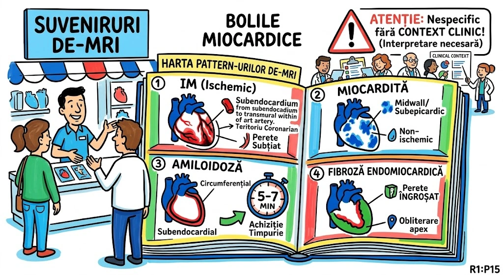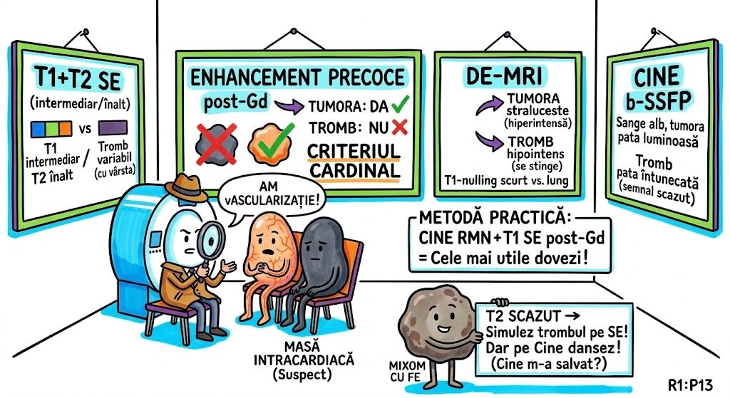 Camera de ancheta a radiologului — patru dovezi atarnate pe perete. Detectivul (radiologul) interogheaza suspectul (masa intracardiaca): "Cine esti tu — tumora sau tromb?" Dovada 1 (T1+T2): ambigua — trombul recent arata ca tumora pe T1. Detectivul ridica din sprancene. Dovada 2 (Gd enhancement): "Absorbi contrast?" Tumora: "Da, sunt vascularizata." Tromb: "Nu. Sunt un cheag mort." Aceasta dovada inchide 80% din cazuri. Dovada 3 (DE-MRI): tumora straluceste peste miocard (T1-nulling scurt), trombul dispare sub miocard (T1-nulling lung). Dovada 4 (Cine): tumora e luminoasa, trombul e intunecat pe fondul sangvin alb. Detectivul incheie: "Cine + T1 post-Gd = cele doua dovezi suficiente in 90% din cazuri. DE-MRI e martorul bonus." Exceptia de serviciu: mixomul cu depozite de fier — T2 scazut, arata ca tromb pe SE. Dar pe Cine, mixomul danseaza prin valva (p4). Trombul sta pe scaun.