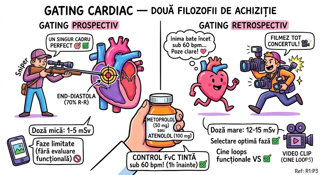 Gating prospectiv vs. retrospectiv e ca diferenta dintre a face o poza cu telefonul (click rapid, baterie putina) vs. a filma tot evenimentul si apoi sa extragi screenshot-uri (filmare completa, baterie multa). Poza unica e suficienta cand vrei doar anatomia. Filmul complet e necesar cand vrei sa vezi si cum functioneaza inima in miscare.