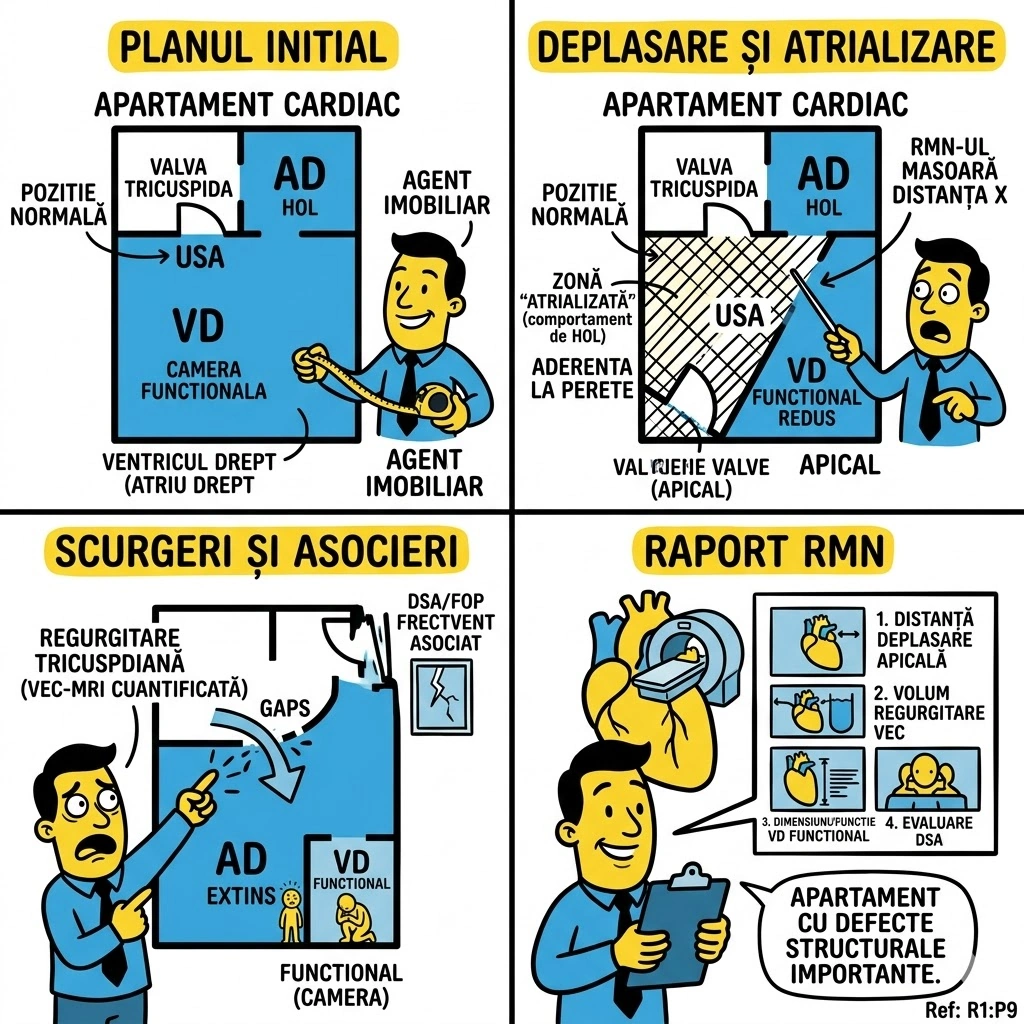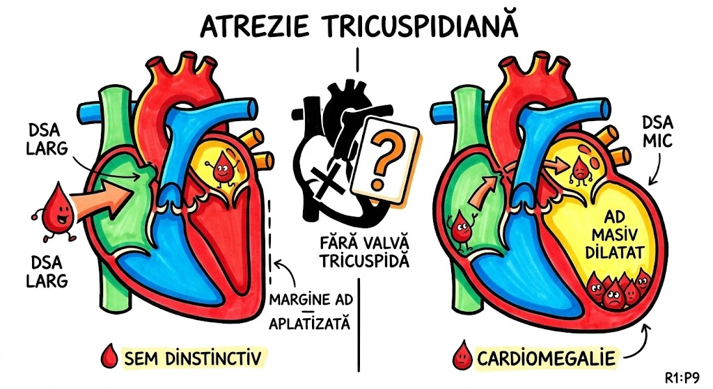 Anomalia Ebstein vs. DSA simpla e ca diferenta dintre un apartament cu usa mutata + camera micsorata + scurgeri la usa + gaura in perete vs. un apartament care are doar gaura in perete. In Ebstein, patru probleme se combina intr-un singur spatiu. DSA e frecvent asociata, dar e doar un detaliu intr-un tablou mai complex. VD-ul functional redus e problema centrala — similar cu VD-ul supraincarcat din TOF, dar prin mecanism diferit.