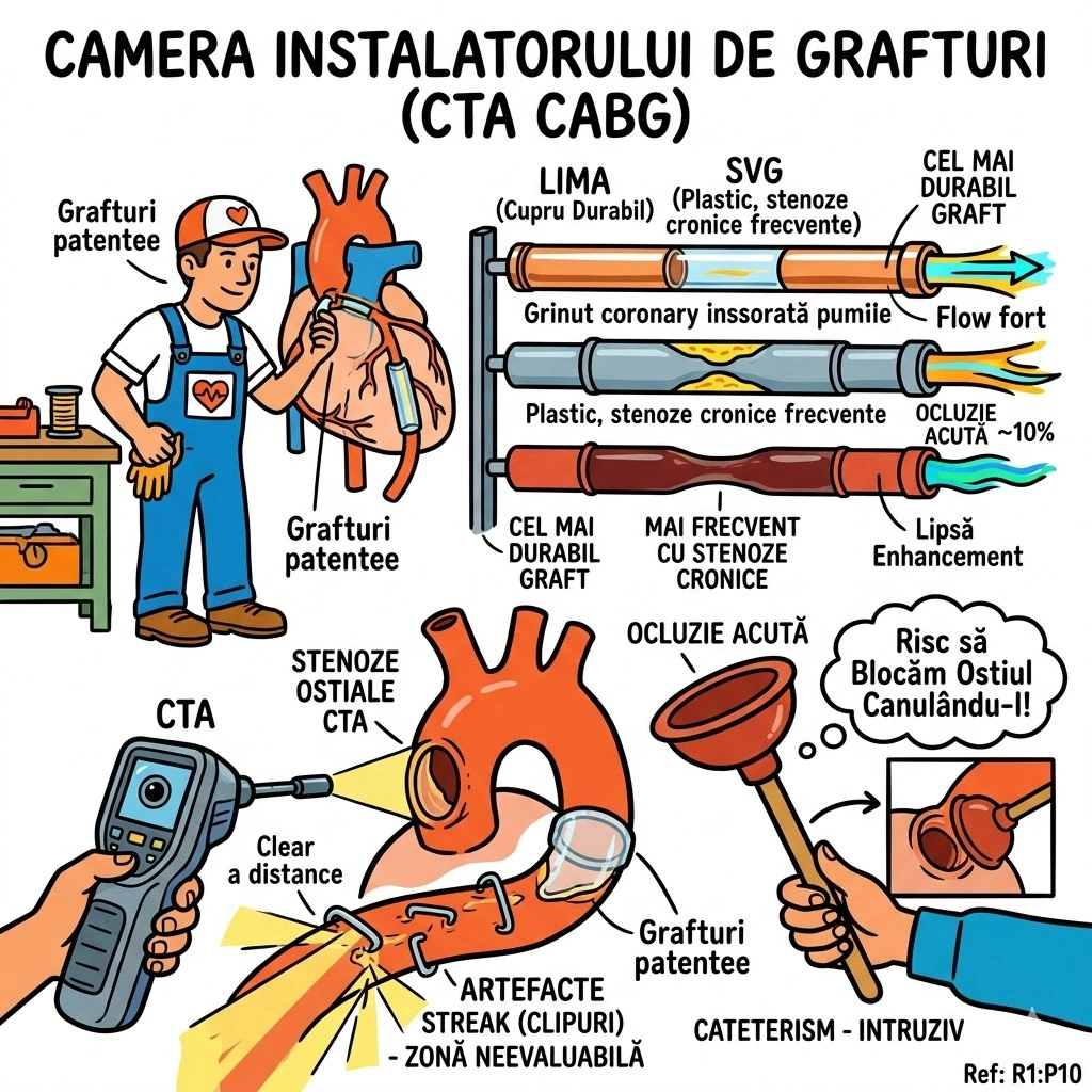 CTA vs. cateterism pentru stenozele ostiale ale grafturilor e ca verificarea unei tevi de apa cu o camera endoscopica (CTA — vezi fara sa atingi) vs. cu un dop de cauciuc (cateterism — pui dopul sa masori presiunea dar risc sa blochezi teava chiar tu). CTA vede anastomoza fara sa interactioneze cu ea. Cateterismul, prin canulare selectiva, poate ocluzia ostiul.