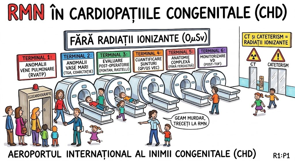 RMN vs. cateterism in era moderna a CHD e ca diferenta dintre a face cumparaturi online (RMN — vezi totul de acasa, fara deplasare, fara riscuri) vs. a merge fizic in magazin (cateterism — util doar cand trebuie sa atingi sau sa repari ceva). Cumparaturile online nu au inlocuit magazinul — l-au rezervat pentru situatiile in care chiar trebuie sa fii acolo (interventii). Diagnosticul se face de acasa.