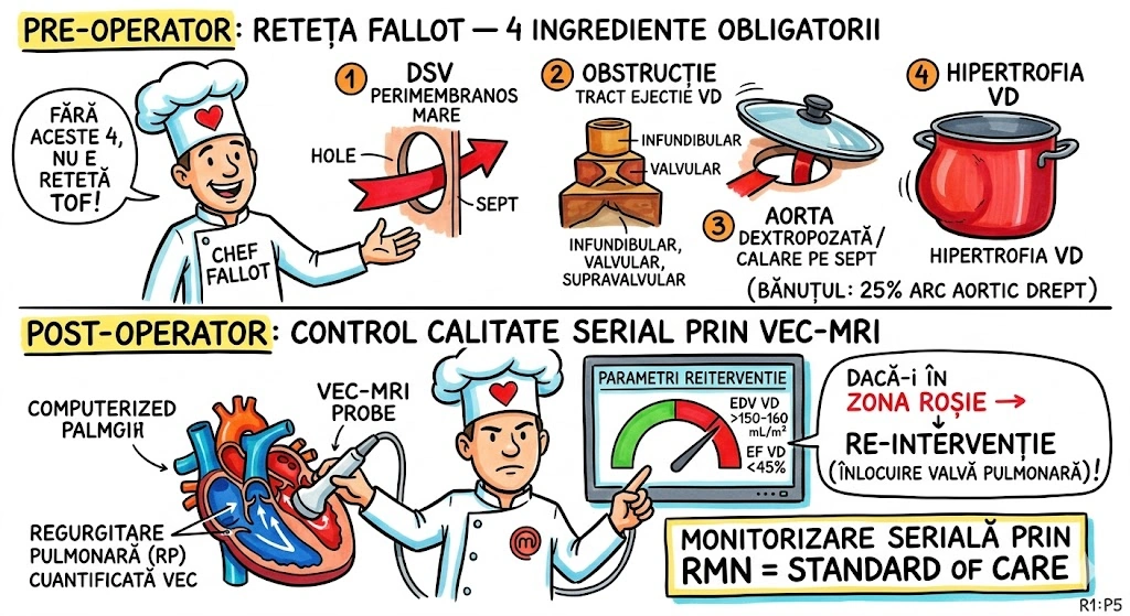 Monitorizarea TOF post-operator e ca revizia tehnica periodica a masinii dupa o reparatie majora: nu intrebi "merge masina?" — intrebi "cat pierde motorul (RP) si cat s-a dilatat rezervorul (EDV VD)?" Pragurile sunt stricte: peste 150-160 mL/m² sau EF sub 45% = masina nu mai trece ITP-ul, se inlocuieste piesa (valva pulmonara). Fara revizie periodica prin RMN, degradarea trece neobservata pana la defectiune critica.