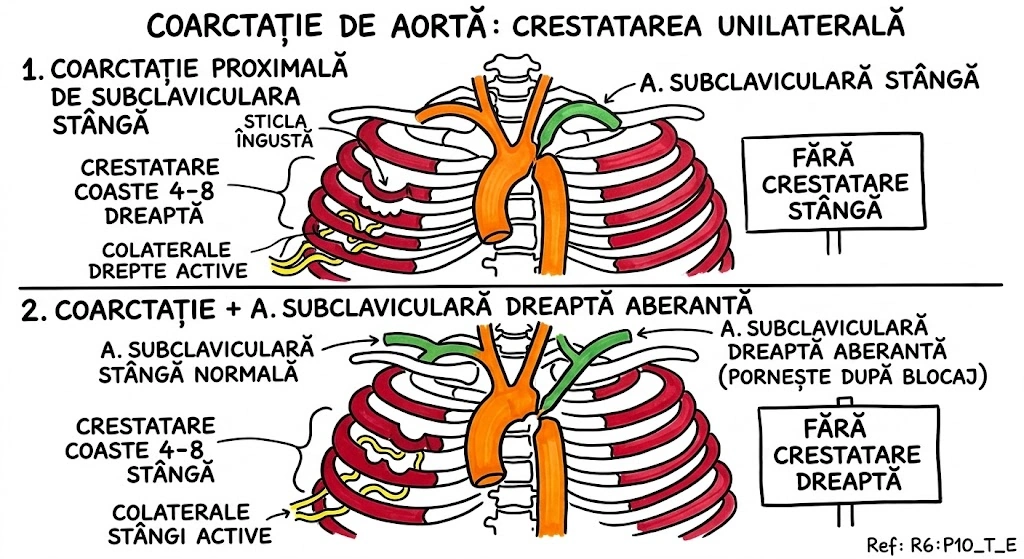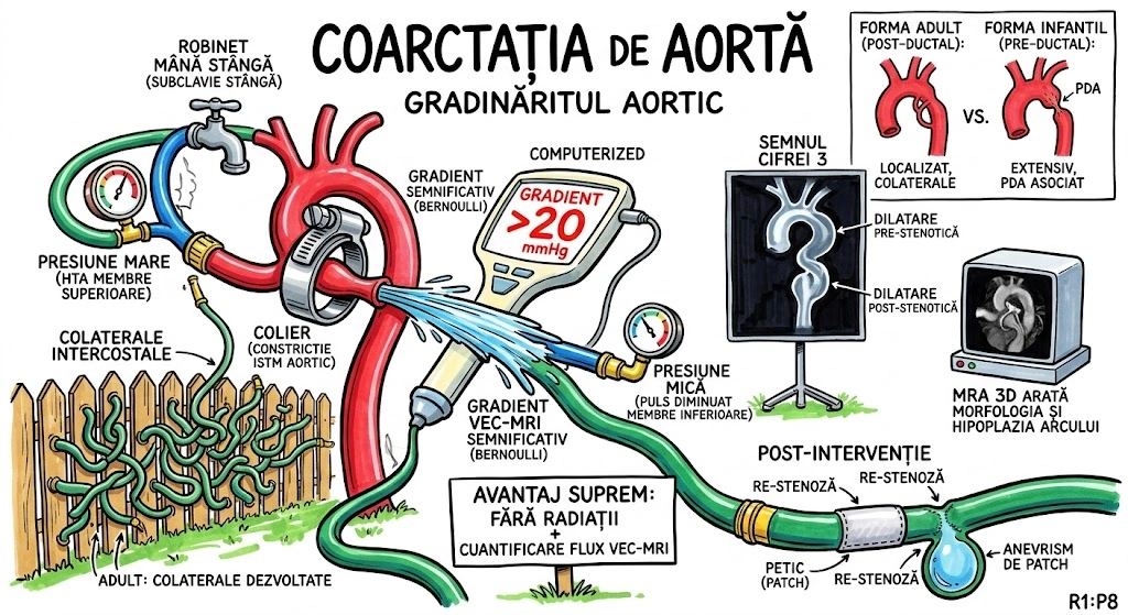 Coarctatia pre-ductala vs. post-ductala e ca diferenta dintre un furtun strans pe toata lungimea (copilul — furtunul inca nu si-a dezvoltat ramificatii de compensare) vs. un furtun strans intr-un singur punct dar cu zeci de furtunase alternative crescute in timp (adultul — colateralele intercostale). Prima e urgenta, a doua e descoperita la controlul de rutina cand se observa hipertensiune la brate si puls diminuat la picioare.
