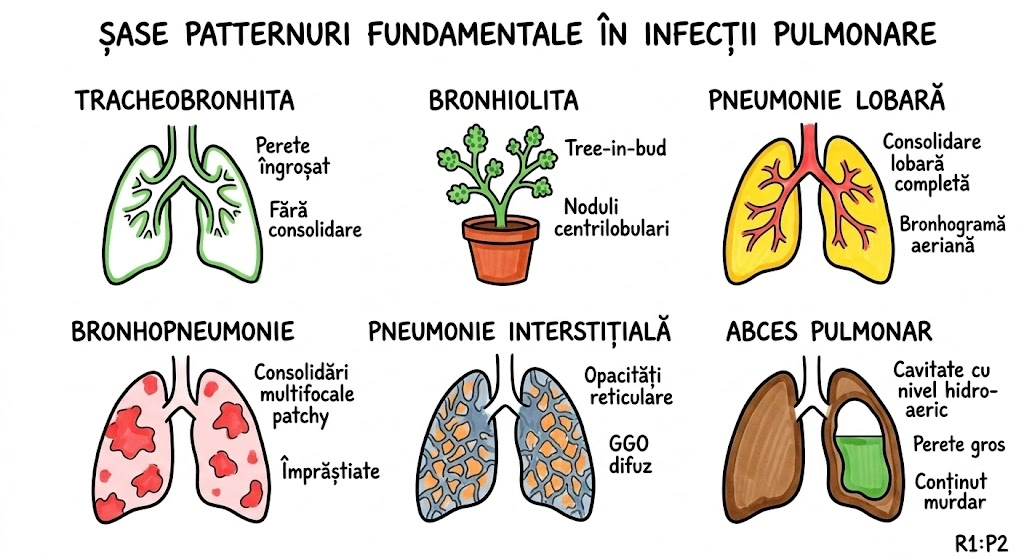 Ce Memoram: Cinci pattern-uri focale: (1) Consolidare lobara = pneumococ, Klebsiella, Legionella, TBC; (2) Lobara cu expansie = Klebsiella clasic; (3) Rotunda = carcinom bronhiolo-alveolar, pneumonie rotunda; (4) Segmentara = obstructie bronsica, embolie cu infarct; (5) Focala in pete = bronhopneumonie. Evolutie temporala: rapid (ore) = edem/aspiratie/hemoragie; persistent (4–6 saptamani) = eozinofilica/BOOP/carcinom.