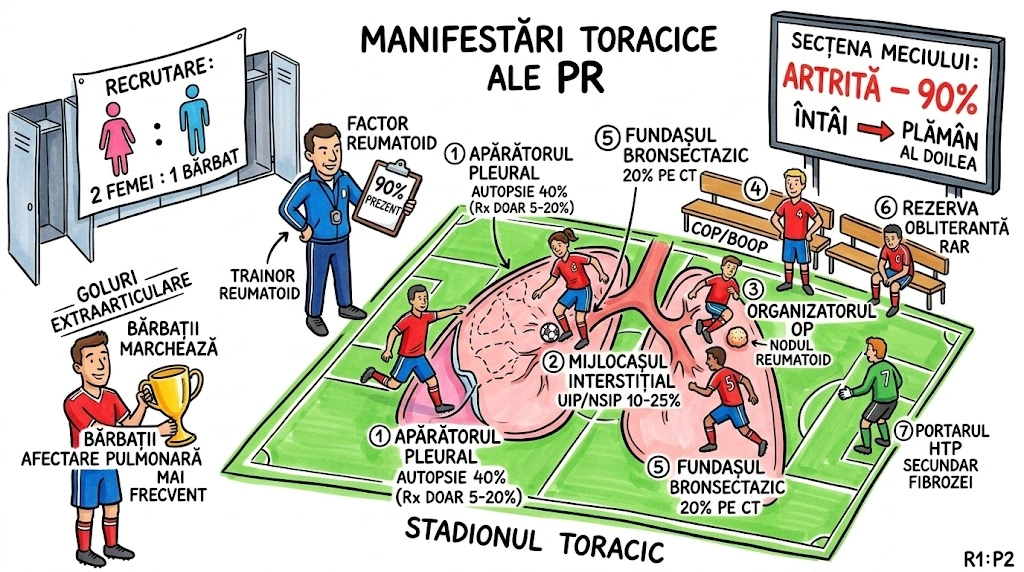 Cinci formatii de atac pe terenul de fotbal pulmonar. Formatia 1 (Atac lobar): toata echipa ocupa un singur sector — Pneumococul e antrenorul clasic, dar si Klebsiella, Legionella si TBC pot conduce. Formatia 2 (Atac lobar cu expansie): echipa nu doar ocupa sectorul, ci il si dilata — Klebsiella e antrenorul favorit, scizurile se bombeaza sub presiune. Formatia 3 (Atac rotund): o singura minge mare, sferica — carcinom bronhiolo-alveolar sau pneumonie rotunda. Formatia 4 (Atac segmentar): focalizat pe un singur coridor — obstructie bronsica sau embolie cu infarct. Formatia 5 (Atac in pete): mini-atacuri dispersate pe teren — bronhopneumonie, diseminare TBC. Cronometrul meciului: gol rapid in ore = edem, aspiratie, hemoragie; meci de uzura 4–6 saptamani = eozinofilica, BOOP, carcinom.