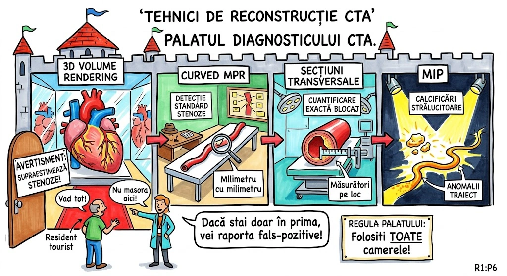 3D Volume Rendering singur pentru stenoze e ca Google Maps in modul satelit fara zoom: vezi tot orasul dar nu poti masura latimea strazii. Curved MPR e ca GPS-ul cu navigatie pe traseu — urmaresti drumul coronarian exact. Sectiunile transversale sunt masuratorile cu ruleta la fata locului. Toate impreuna dau verdictul corect.