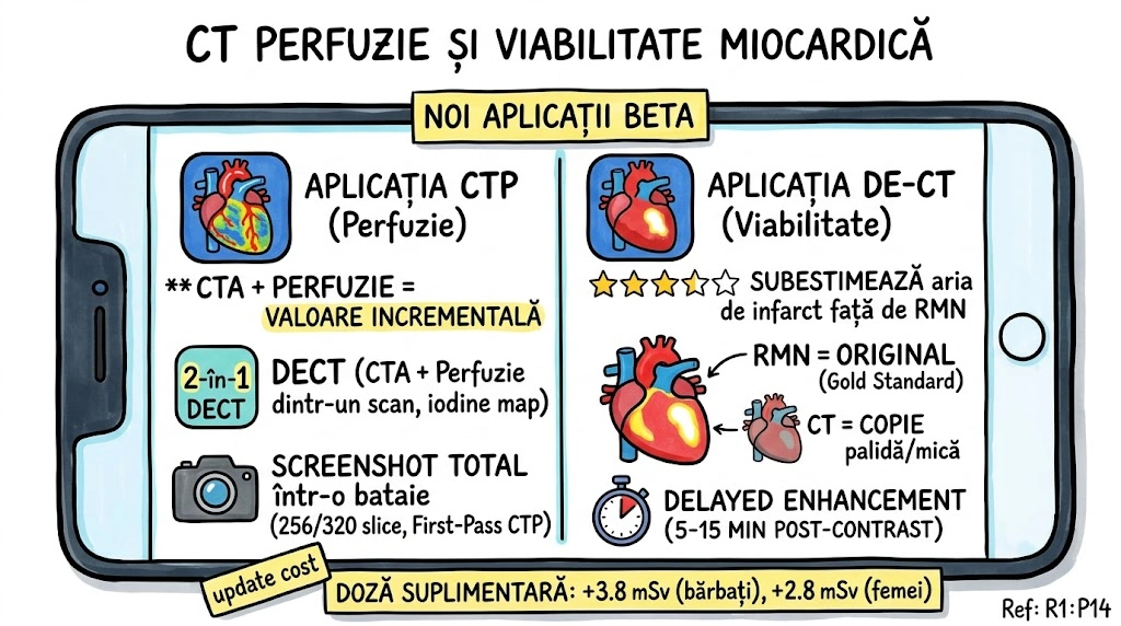 CT viabilitate vs. DE-MRI e ca o copie xerox vs. originalul: ambele arata aceeasi imagine, dar copia xerox (CT) e usor mai palida si mai mica decat originalul (RMN). Subestimarea sistematica a ariei de infarct = CT vede mai putin decat exista real. De aceea RMN ramane gold standard pentru viabilitate — nu pentru ca CT nu functioneaza, ci pentru ca functioneaza mai putin.