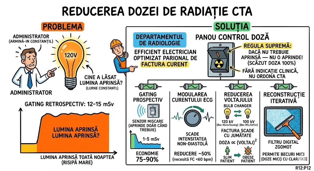 Doza proportionala cu patratul voltajului e ca facturat la electricitate in functie de puterea aparatelor: treci de la 120 kV la 100 kV si crezi ca reduci 17% — de fapt reduci 50% pentru ca doza = voltaj². E ca si cum ai reduce temperatura cuptorului de la 200°C la 180°C si ai descoperi ca factura la gaz a scazut cu mult mai mult decat proportional.
