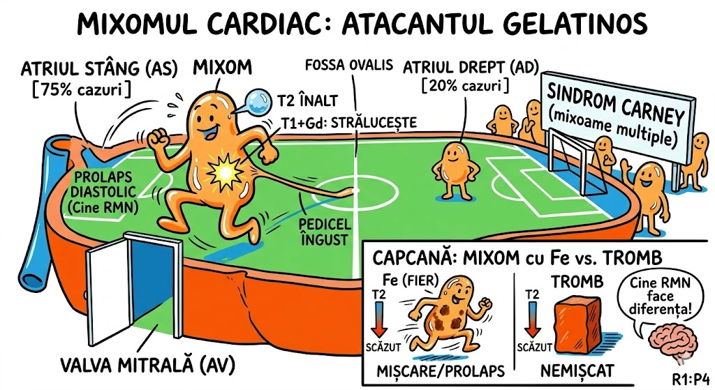 Un jucator de fotbal care sta cu un singur picior (pedicelul) fixat pe linia de centru (fossa ovalis) a terenului — atriul stang. In fiecare diastola, valva mitrala se deschide ca poarta de la vestiar, si mixomul face un sprint scurt prin ea, apoi se intoarce — prolaps diastolic documentabil pe Cine RMN. E gelatinos, amorf, plin de spatiu interstitual — de aceea absoarbe gadolinium ca un burete si straluceste pe T1+Gd. Pe T2, de regula e hiperintens. Dar cateva mixoame vechi au depozite de fier din hemoragii anterioare → T2 devine scazut → si brusc, jucatorul nostru arata ca un tromb. Cine RMN il salveaza: trombul sta nemiscat, mixomul danseaza prin valva. Daca sunt multiple mixoame → Sindromul Carney.