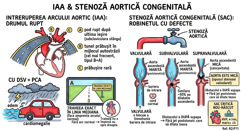 🥊 Ringul Comparatiilor: Intreruperea AP si atrezia venelor pulmonare sunt ca doua case cu defecte complementare: una nu primeste apa (intrare blocata), cealalta nu o poate evacua (iesire blocata). Ambele duc la un plaman suferind, dar prin mecanisme opuse. Hipoplazia pulmonara (p8) le uneste — ambele sunt cauze ale ei. Diferenta fata de sindromul scimitar (p9): in scimitar, apa de iesire merge in alta directie (VCI); aici, apa nu are pe unde sa iasa deloc.