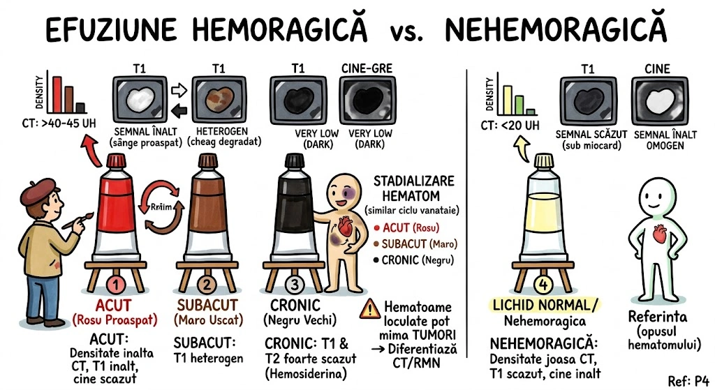 Pivnita Chirurgiei Cardiace: trei sticle de vin pericardic, fiecare cu eticheta de varsta. Sticla acuta (rosie, stralucitoare pe T1, opaca pe cine): "Tocmai turnata — chirurgia a fost saptamana trecuta." Sticla subacuta (cu sediment haotic pe T1 — zone deschise si inchise): "Cheagul e in plina descompunere — fermentare biologica." Sticla cronica (inchisa pe tot — T1, T2, cine): "Hemosiderina a supt tot semnalul — e stinsa ca un vin de 30 de ani uitat in pivnita." Un ecografist vede sticla cronica si spune: "Asta e o tumora." Sommelierul RMN pune gadoliniu: nimic nu se coloreaza. "E hematom vechi, nu tumora. Inapoi in pivnita." Morala: orice masa pericardica post-chirurgie cardiaca e hematom pana la proba contrarie.