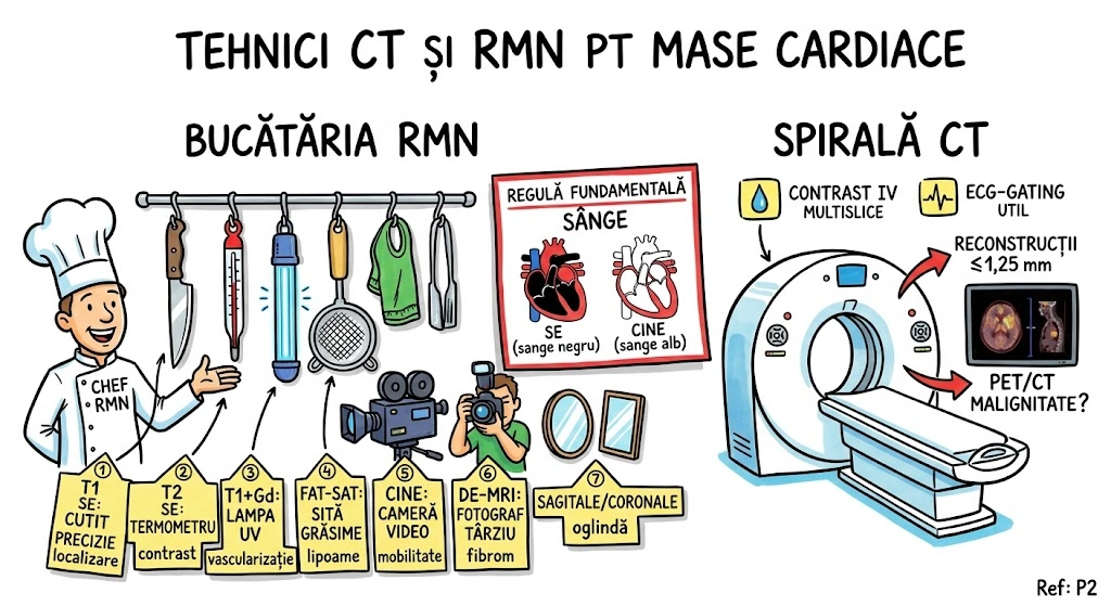 CT: spirala multislice axial cu contrast intravenos (colimatie 1,25–2,5 mm); reconstructii sagitale si coronale de rutina; ECG-gating nu este obligatoriu dar este util pentru masele intracardiace; PET/CT poate sugera natura maligna a maselor. RMN — 7 secvente si roluri: (1) T1-ponderat SE — morfologie si localizare; (2) T2-ponderat SE — contrastul intre tumora si miocard, componente chistice/necrotice; (3) T1 SE + Gd-DTPA — caracterizare tisulara, vascularizatie, delimitare margini; (4) T1 fat-saturation + Gd — diagnosticul lipoamelor (suprimarea semnalului grasos); (5) Cine GRE sau b-SSFP — evaluarea mobilitatii maselor, functiei valvulare, diferentierea tromb vs. tumora; (6) DE-MRI (IR-GRE la 10–20 minute) — fibroame (hyperenhancement tardiv) si trombi (semnal scazut fata de miocard); (7) Imagini sagitale si coronale — extensie mediastinala. Regula fundamentala: pe SE (sange negru) sangele curgator are semnal scazut; pe Cine-GRE/b-SSFP (sange alb) poolul sangvin are semnal inalt, iar trombii apar cu semnal scazut fata de sange.