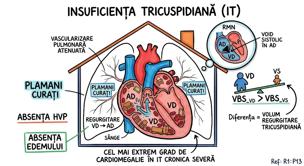 Atriul drept e camera in care locuiesc trei animale de companie pe care fiecare radiolog trebuie sa le cunoasca pe nume, altfel cheama serviciul de urgenta degeaba. Pisica (Crista terminalis): sta nemiscata pe peretele posterior, intre VCS si VCI. E o banda fibro-musculara — reziduu al septum spurium. A fost acolo de la nastere. Nu e tumora — e mobilier anatomic. Perusul de aur (Valva eustachiana): pluteste la junctiunea VCI-AD, ca un peste ornamental in acvariu. E remnantul valvei VCI din viata fetala. Uneori e prominent si mimeaza o masa intracavitara. Dar nu moare nimeni de la un perus ornamental. Hamsterul pe roata (Reteaua Chiari): o retea fina de fibre in AD — derivata din valvulele venoase, cu regresie variabila. Poate aparea ca un nodul sau o masa filamentara. Arata dramatic. Semnificatie patologica: zero. Concluzie: inainte sa declari "masa in AD", verifica daca nu e doar animalul de casa al anatomiei.