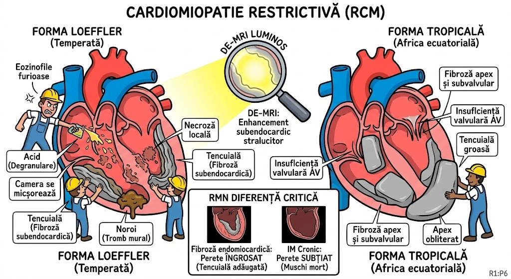 O tabla de sah cu 8 piese, fiecare cu miscarile ei specifice care o diferentiaza de toate celelalte. Regele (Pericardita constrictiva cronica): ≥4 mm, enhancement tardiv, calcificari, sept care face bouncing. Regina (Cardiomiopatia restrictiva): arata similar dar pericardul e normal — enhancement subendocardial, fara calcificari, miscare normala. A le confunda e ca si cum ai confunda regele cu regina in sah — piese diferite cu miscari complet diferite, dar stau pe aceeasi linie. Turnul (CT): stabil, puternic la calcificari. Nebunul (RMN): merge diagonal, vede tot — grosime, caracterizare, fibroza. Pionul (TTE): mic dar vine primul pe tabla. Calul (DE-MRI): sare peste piese, diferentiaza fibroza de inflamatie in mod unic. Cele 10 reguli ale jocului ghideaza mutarile diagnostice.