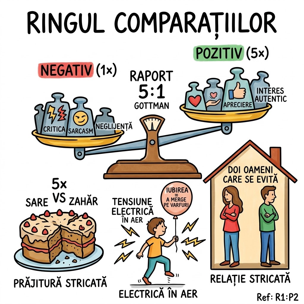 π₯ Ringul Comparatiilor: Raportul 5:1 in relatie functioneaza exact ca proportiile dintr-o reteta de gatit: nu sunt sugestii β fac parte din chimia fundamentala a preparatului. Cand faci o prajitura si pui de 5 ori mai multa sare decat zahar, nu obtii "o prajitura ceva mai sarata" β obtii ceva pe care nimeni nu-l poate inghiti. Raportul 5:1 al lui Gottman demonstreaza acelasi principiu aplicat relatiei de cuplu: daca interactiunile negative (critica, sarcasm, neglijenta) sunt mai frecvente decat cele pozitive (apreciere, atingere, interes autentic), nu obtii "o relatie ceva mai dificila" β obtii doi oameni care se evita in propria casa. Diferenta critica dintre prajitura si relatie: prajitura stricata o arunci si faci alta in 2 ore. Relatia "stricata" contamineaza si copilul care sta la masa si simte acea tensiune electrica in aer, invatand ca "iubirea" inseamna sa mergi pe varfuri si sa nu faci zgomot.