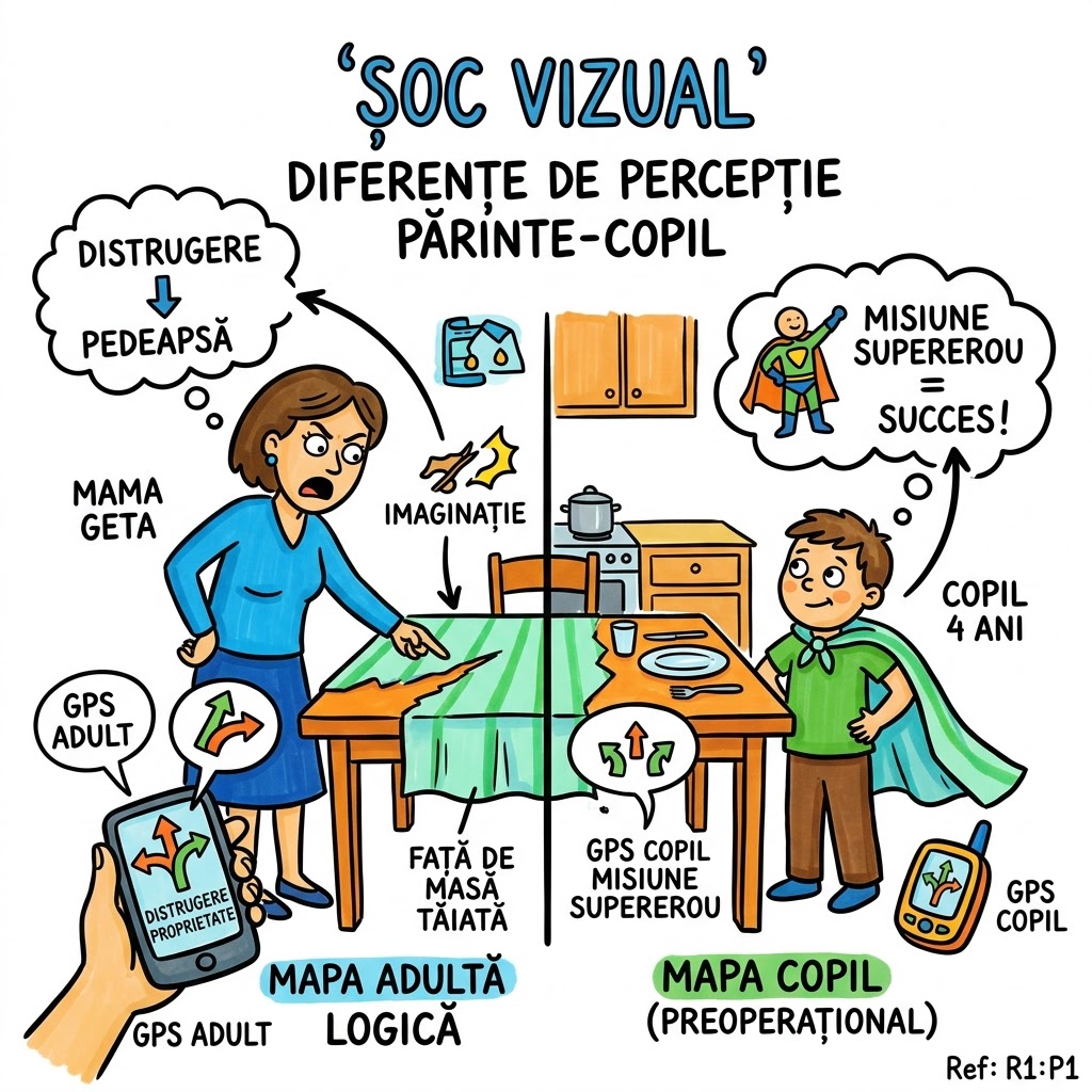Imagineaza-ti ca esti turist si primesti trei harti β una pentru Franta, una pentru Japonia, una pentru Luna. Arat diferit, au simboluri diferite, drumurile nu seamana deloc. Absurd ar fi sa incerci sa navighezi Tokyo-ul cu harta Parisului β ai ajunge in zid la prima intersectie. Mama Geta incerca sa navigheze creierul unui copil de 4 ani cu harta adulta. "De ce ai taiat fata de masa?" intreba ea logic. In harta ei (adulta), fata de masa = proprietate = valoare = distrugere = trebuie pedepsit. In harta lui (Preoperationala), fata de masa = stofa mare = material pentru pelerina = Misiune Supererou = SUCCES! Aceeasi intersectie, doua harti complet diferite. El statea mandru, cu fata de masa pe umeri, asteptand aplauze β si primea o cearta. Confuzia din ochii lui β acea expresie de "Dar eu am facut ceva grozav, de ce esti suparata?" β era sunetul a doua GPS-uri care dadeau directii opuse in acelasi timp, iar copilul statea la mijloc, naucit de zgomot.