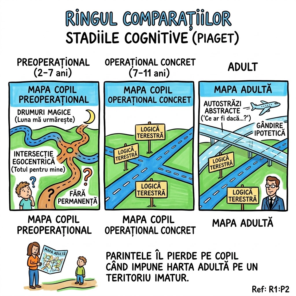 π₯ Ringul Comparatiilor: Stadiile cognitive ale lui Piaget functioneaza exact ca hartile turistice pentru tari diferite: fiecare harta este completa si corecta pentru teritoriul EI, dar complet inutila pentru alt teritoriu. Harta unui copil Preoperational (2-7 ani) include drumuri magice (luna il urmareste), zone fara permanenta (daca nu vede un lucru, acesta nu exista) si intersectii egocentrice (totul se intampla din cauza LUI sau pentru EL). Harta unui copil Operational Concret (7-11 ani) are drumuri logice, dar toate sunt terestre β nu exista autostrazi abstracte ("Ce ar fi daca...?"). Harta adulta are si drumuri terestre, si autostrazi abstracte, si avioane de gandire ipotetica. Diferenta: turistul care foloseste harta gresita se pierde. Parintele care foloseste harta gresita nu se pierde β il pierde pe copil, pentru ca ii cere sa navigheze pe drumuri care nu exista inca in creierul lui.