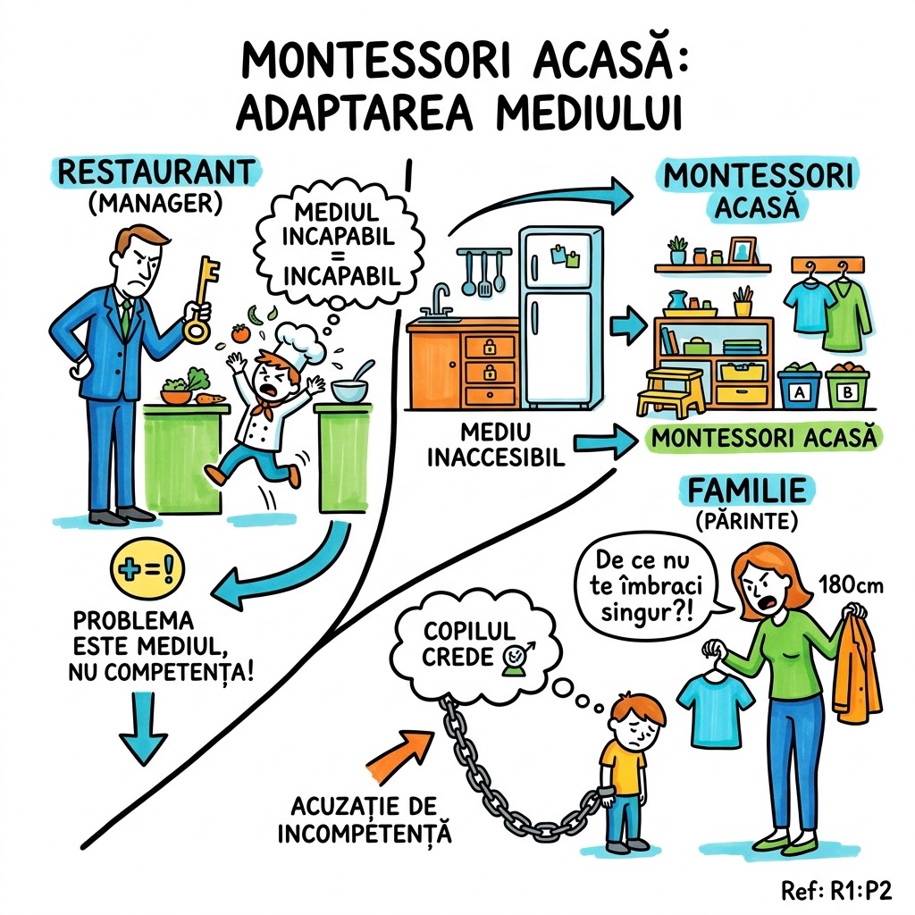 π₯ Ringul Comparatiilor: Montessori acasa functioneaza exact ca redesenarea unui restaurant pentru bucatarul sau: un restaurant unde blatul e prea inalt, ingredientele sunt incuiate si ustensilele sunt inaccesibile nu produce un bucatar "incapabil" β produce un mediu incapabil. Schimba inaltimea blatului, deschide sertarele, pune ingredientele la indemana β si acelasi bucatar care "nu facea nimic" incepe sa gateasca. Aplicat acasa: copilul care "nu se imbraca singur, nu se spala, nu-si strange" nu are o problema de competenta β are o problema de mediu. Diferenta: in restaurant, managerul care nu adapteaza bucataria este considerat incompetent. In familie, parintele care nu adapteaza mediul il acuza pe copil de incompetenta β si copilul il crede.