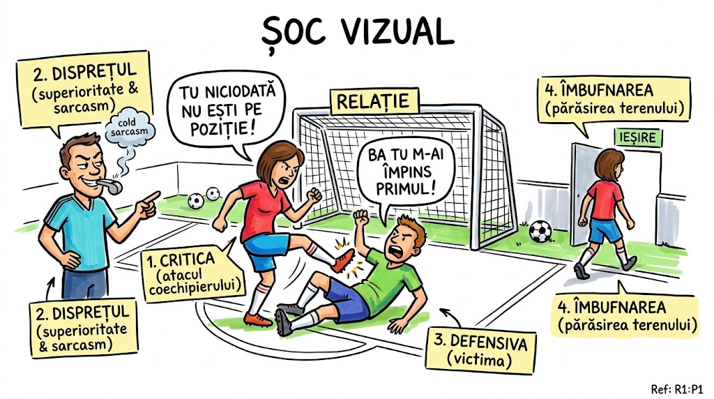 π₯ Ringul Comparatiilor: Cei Patru Calareti in comunicarea de cuplu functioneaza exact ca cele patru fault-uri majore dintr-un meci de fotbal care duc la eliminare: fault-ul prin alunecare (Critica β ataci persoana fizic in loc sa mergi pe minge/problema), fault-ul flagrant (Dispretul β lovesti intentionat si batjocoritor, cel mai sanctionat), simularea (Defensiva β te arunci la pamant si urli ca esti victima cand tu ai fost cel care a lovit primul) si parasirea terenului (Imbufnarea β iesi pur si simplu din joc si refuzi sa mai joci). Diferenta esentiala: la fotbal, un jucator eliminat primeste un cartonas rosu si meciul continua fara el. In relatie, "cartonasul rosu" este copilul care sta pe margine, urmarind cum ambii jucatori se lovesc reciproc β si inregistreaza fiecare fault ca model pentru viitoarele lui relatii.