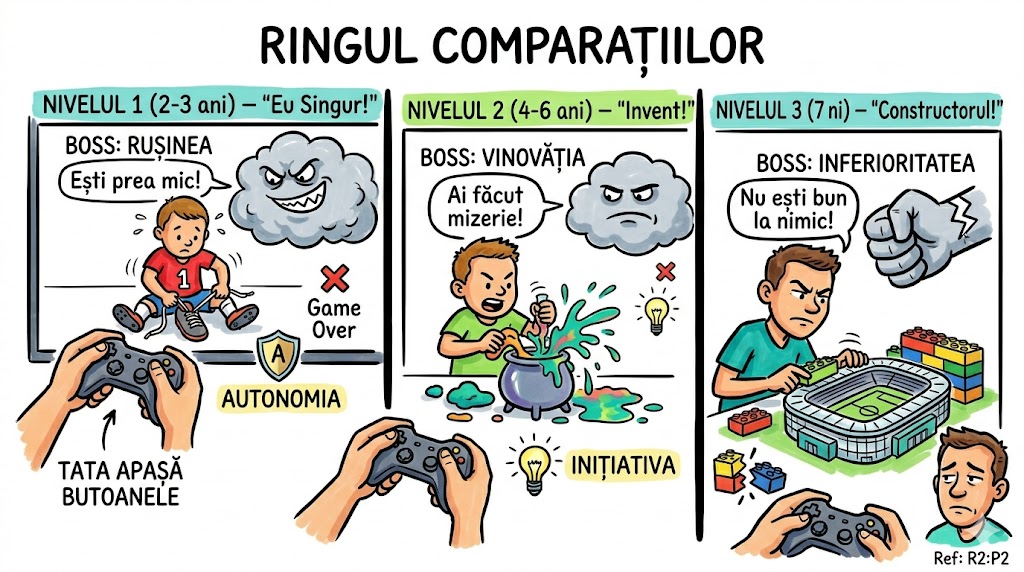 Imagineaza-ti ca viata copilului tau e un joc video cu trei nivele. La fiecare nivel, Eroul are o Misiune specifica si un Boss de infrant. NIVELUL 1 (2-3 ani) β Eroul "Eu Singur!": Misiunea e sa faca lucruri singur β sa se imbrace, sa manance, sa toarne apa. Boss-ul e RUSINEA ("Esti prea mic, nu poti!"). Daca ii lasi sa incerce (si sa verse), invinge Boss-ul si castiga superputerea AUTONOMIEI. NIVELUL 2 (4-6 ani) β Eroul "Inventatorul": Misiunea e sa explore si sa creeze β potiuni in cada, forte din plaStelina, intrebari "De ce?" pana iti bubuie capul. Boss-ul e VINOVATIA ("Esti rau ca ai facut mizerie!"). Daca ii lasi sa inventeze (si sa murdAreasca), invinge Boss-ul si castiga superputerea INITIATIVEI. NIVELUL 3 (7-10 ani) β Eroul "Constructorul": Misiunea e sa fie bun la CEVA si sa-si compare competenta cu a celorlalti. Boss-ul e INFERIORITATEA ("Nu esti bun la nimic"). Tatal Mitu statea in spatele ecranului si apasa butoanele pentru copilul lui de 3 ani β ii lega sireturile, ii imbraca, ii turna laptele. Isi imagina ca "il ajuta". De fapt, ii dadea viata suplimentara direct Boss-ului Rusinii. Copilul nu apuca sa invete sa tina controller-ul in mana proprie β si cand a ajuns la Nivelul 2, inca se uita la tata sa apese butoanele pentru el. Sunetul "Game Over" al misiunilor neindeplinite β acel bip scurt si rece β e insotit de o senzatie de greutate in piept pe care copilul nu o poate numi, dar o poarta cu el in fiecare dimineata cand tata il imbraca in tacere.