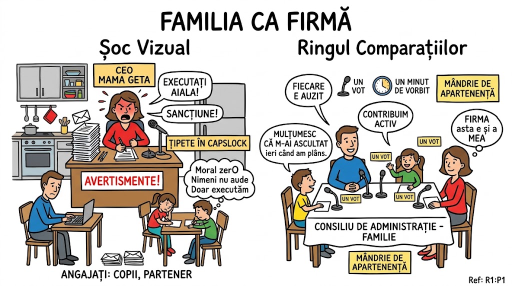 Imagineaza-ti ca familia ta e o firma β "Familia SRL". CEO-ul (Mama Geta) ia toate deciziile singura, din biroul ei (bucataria), comunicate prin email-uri tiparite cu CAPSLOCK (tipete). Nu exista Consiliu de Administratie. Nu exista sedinte. Angajatii (copiii, partenerul) primesc ordine si executa β sau nu executa, si atunci primesc "avertismente" (sanction, tipete suplimentare). Moralul in "firma" e zero. Nimeni nu se simte auzit. Nimeni nu vine cu idei. Toata lumea asteapta sa treaca programul. Dar o firma functionala are un Consiliu de Administratie care se intruneste saptamanal: fiecare membru β de la CEO la cel mai recent angajat β are un scaun la masa, un minut de vorbit si un vot. Sedinta de Familie e acel Consiliu. Masa din sufragerie devine sala de consiliu. Mama Geta a anuntat prima sedinta intr-o duminica: "Azi tinem Consiliu de Administratie." Copilul de 6 ani a ras: "Ce-i aia?" "E o intalnire in care fiecare spune ce a mers bine, ce n-a mers, si ce facem saptamana viitoare. Si TOATA lumea vorbeste." La "Aprecieri", copilul a zis: "Multumesc ca m-ai ascultat ieri cand am plans." Mama Geta a simtit ceva in piept β acea senzatie calda care urca de la stomac si iti strange gatul, ca un nod care nu e dureros, dar e foarte prezent. Pentru prima data, "firma" functiona ca o echipa.