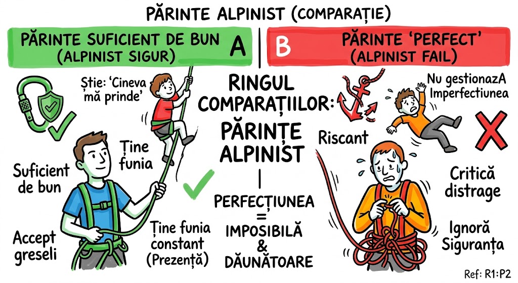 π₯ Ringul Comparatiilor: Parintele "suficient de bun" functioneaza exact ca un alpinist care tine o funia de siguranta: nu trebuie sa fii cel mai bun alpinist din lume (parintele perfect nu exista), trebuie doar sa tii funia (sa fii prezent, sa raspunzi "suficient de des si suficient de bine"). Un alpinist care isi critica fiecare miscare ("Am tinut funia cu 3 cm prea in stanga!") pierde concentrarea si, ironic, devine mai periculos. Un alpinist care accepta ca va face greseli dar tine funia constant produce un catarAtor (copil) care stie: "Daca alunec, cineva ma prinde." Diferenta: in alpinism, perfectiunea e apreciata dar nu obligatorie. In parenting, perfectiunea e imposibila SI daunatoare β un parinte "perfect" produce un copil care nu invata sa gestioneze imperfectiunea.