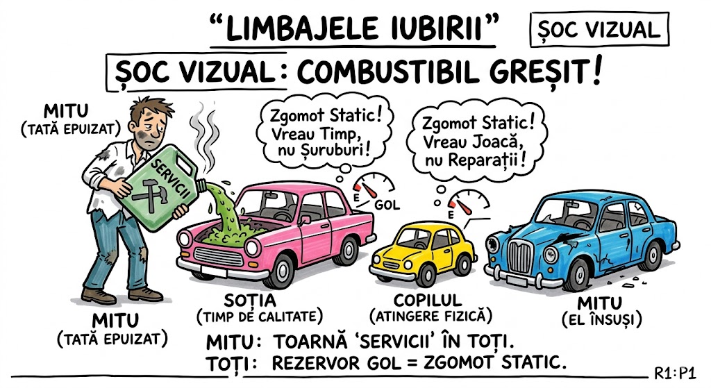 Imagineaza-ti ca partenerul tau e o masina cu un rezervor gol. Tu vrei sa-l alimentezi. Dar masina lui merge pe motorina, iar tu te-ai oprit la pompa de benzina. Torni cu grija, plin de bune intentii, 50 de litri de benzina scumpa. Masina nu porneste. Torni inca 20. Tot nimic. Tu urli la masina: "TI-AM PUS COMBUSTIBIL! DE CE NU MERGI?" Masina tace, cu un miros intepator de benzina nearsA β senzatia aia chimica care iti irita nasul si te face sa strangi din ochi. Tatal Mitu a facut exact asta trei ani la rand. Limba lui de iubire era Serviciile β asa ca repara tot in casa, gatea, ducea copilul la gradinita, platea facturile. Sotia lui primea pe frecventa "Timp de calitate". Ea nu avea nevoie de o casa reparata; avea nevoie de 15 minute in care el sa-i puna telefonul jos si sa o intrebe "Cum te simti?" β si sa asculte raspunsul. Copilul de 6 ani, intre timp, tragea de tata sa se joace (frecventa lui: Atingere fizica), dar tata era mereu "ocupat cu reparatiile". Trei rezervoare goale. Un singur tata epuizat care se intreba sincer de ce "nimeni nu apreciaza cat muncesc".