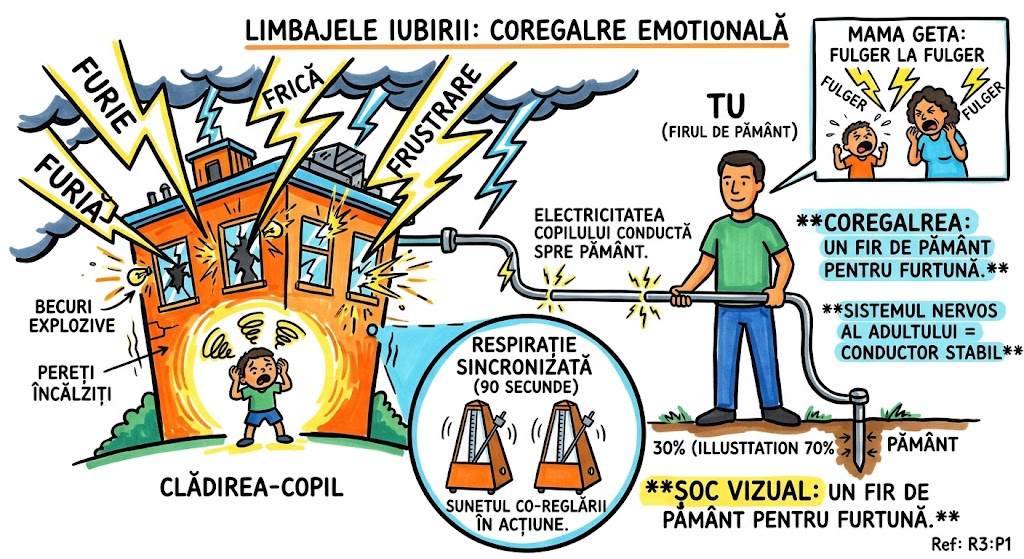 Imagineaza-ti ca copilul tau in furtuna emotionala este o cladire lovita de fulger. Electricitatea (furia, frica, frustrarea) strabate fiecare etaj, incalzeste peretii, aprinde becurile pana la explozie. Cladirea nu se poate impamanta singura β are nevoie de un fir de pamant: un conductor extern, stabil, conectat la sol, care preia electricitatea si o conduce in siguranta in pamant, fara sa arda nimic. TU esti firul de pamant. Vocea ta calma (nu "Calmeaza-te!!!" β ci un ton jos, lent, ca un hum de transformator), bratele tale deschise (nu ridicate amenintator), respiratia ta lenta (pe care copilul o preia inconstient dupa 30-60 secunde) β toate acestea sunt conductoarele care preiau electricitatea copilului si o trimit in pamant. Mama Geta adauga fulger la fulger. Copilul tipa β ea tipa inapoi. Electricitate dubla, zero fir de pamant. Casa ardea in fiecare seara. Intr-o zi a incercat altceva: s-a asezat pe podea, langa copilul care urla, si a respirat. Doar atat. Nu a vorbit, nu a explicat, nu a reparat. A respirat β inspir 4 secunde, expir 6. Dupa 90 de secunde care au parut 90 de minute, copilul a inceput sa inspire la fel. Sunetul respiratiei sincronizate β acel ritm care incepe diferit si sfarseste la unison, ca doua metronoame pe aceeasi placa β e sunetul co-reglarii in actiune. Nu e magie. E fizica: sistemul nervos al copilului se sincronizeaza cu al adultului din proximitate.