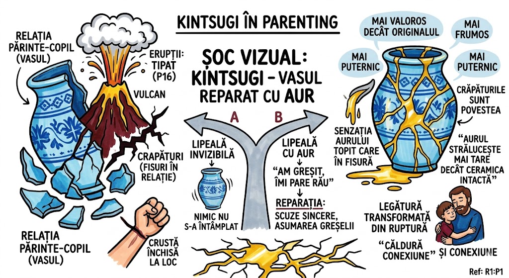 In Japonia exista o arta numita Kintsugi β cand un vas de ceramica se sparge, in loc sa fie aruncat sau lipit invizibil, fisurile sunt umplute cu AUR. Vasul reparat cu aur nu e mai slab decat originalul β e mai frumos. Fisurile devin parte din povestea lui, nu un defect ascuns. Relatia parinte-copil e vasul. Eruptiile tale (p16) il crapa. Reparatia (scuze sincere, asumarea greselii) e aurul. Tatal Mitu a tipat intr-o seara β "capacul" a sarit, vulcanul a erupt, copilul a inghetat. Dupa 30 de minute, cand crusta s-a inchis la loc, Tatal Mitu avea doua optiuni: sa lipeasca invizibil (sa faca pe "nimic nu s-a intamplat" β sa ignore) sau sa lipeasca cu aur (sa se intoarca si sa spuna: "Am gresit. Am tipat la tine si asta nu era corect. Nu a fost vina ta. Imi pare rau. Data viitoare voi incerca sa ma opresc si sa respir.") A ales aurul. Copilul l-a imbratisaT. Vasul era tot crapat β dar aurul straluceste mai tare decat ceramica intacta niciodata. Senzatia aurului topit care curge in fisura β acea caldura care transforma ruptura in legatura β e exact ce simte un copil cand parintele se intoarce si spune "Am gresit, imi pare rau."