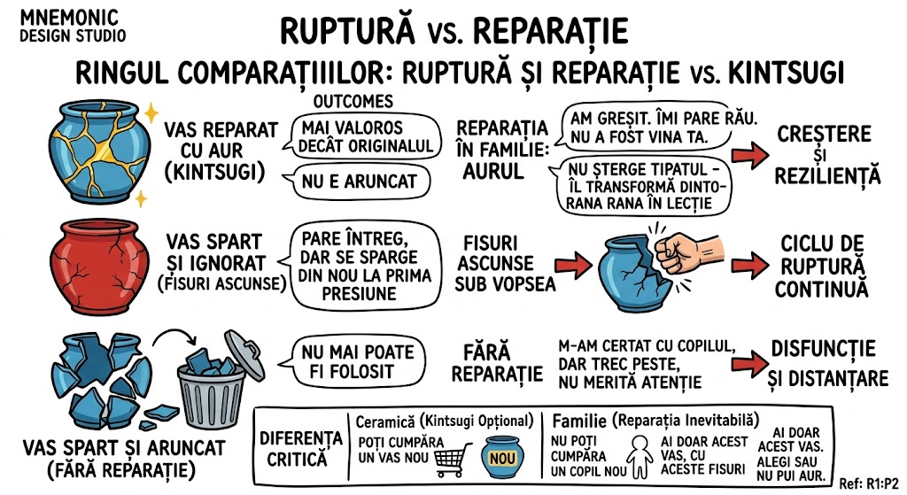 π₯ Ringul Comparatiilor: Ruptura si Reparatia in parenting functioneaza exact ca Kintsugi in ceramica: un vas spart si REPARAT cu aur nu e aruncat β e mai valoros decat originalul. Un vas spart si IGNORAT (fisurile ascunse sub vopsea) pare intreg, dar se sparge din nou la prima presiune. Un vas spart si ARUNCAT ("M-am certat cu copilul, dar trec peste, nu merita atentie") nu mai poate fi folosit. Reparatia in familie e aurul: "Am gresit. Imi pare rau. Nu a fost vina ta." Aceste cuvinte nu sterg tipatul β il transforma dintr-o rana in lectie. Diferenta: la ceramica, Kintsugi e optional β poti cumpara un vas nou. In familie, nu poti "cumpara" un copil nou β ai doar acest vas, cu aceste fisuri, si aurul pe care alegi sau nu alegi sa-l pui.