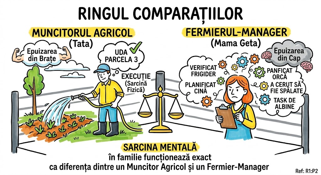 π₯ Ringul Comparatiilor: Sarcina Mentala in familie functioneaza exact ca diferenta dintre un muncitor agricol si un fermier-manager: muncitorul vine, executa ce i se spune ("uda parcela 3"), pleaca si se simte productiv β munca lui se vede, e fizica, are inceput si sfarsit. Fermierul-manager nu paraseste niciodata ferma mental: stie ca solul din parcela 7 are nevoie de calciu, ca ploaia de saptamana viitoare poate strica recolta de tomate, ca pretul graului a scazut si trebuie schimbat planul. Munca lui este invizibila, continua si fara aplauze. In familie, "muncitorul" spala vasele cand i se cere si considera ca a "ajutat echitabil". "Fermierul" a planificat cina, a verificat ce e in frigider, a stiut ca vasele trebuie spalate inainte sa se usuce si a cerut (pentru a suta oara) sa fie spalate. Diferenta: muncitorul executa o sarcina. Fermierul poarta un departament intreg in cap β iar epuizarea din cap e mai grea decat cea din brate.