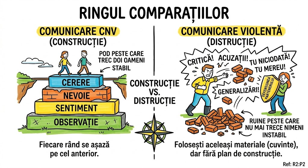 π₯ Ringul Comparatiilor: CNV in comunicarea familiala functioneaza exact ca procesul de constructie a unui zid solid: fiecare rand se asaza pe cel anterior, si daca sari peste un rand, toata structura cade. Un zidar care pune caramizi fara fundatie (Observatie β faptele) construieste ceva ce se prabuseste la prima adiere. Un zidar care pune caramizi fara mortar (Nevoie β motivul din spate) produce un zid din care orice caramida poate fi trasa afara ("Dar de ce iti pasa?"). Comunicarea "violenta" obisnuita (critica, acuzatii, generalizari β "Tu niciodata!", "Tu mereu!") este echivalentul aruncarii caramizilor in cealalta persoana: folosesti aceleasi materiale (cuvinte), dar fara niciun plan de constructie. Diferenta: zidul construit corect (OSNC) devine un pod peste care ambii pot trece. Caramizile aruncate devin ruine peste care nimeni nu mai trece.