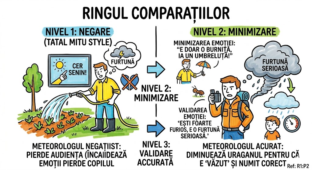π₯ Ringul Comparatiilor: Validarea emotionala functioneaza exact ca o prognoza meteorologica corecta: un meteorolog care raporteaza "Cer senin!" in timpul unui uragan (negarea emotiei β "Nu e nimic!") nu opreste uraganul β il face pe ascultator sa-si piarda increderea in meteorolog. Un meteorolog care spune "Este o burnita, ia un umbreluTa" (minimizarea emotiei β "Mai rau ar fi daca...") trivializeaza experienta. Un meteorolog care raporteaza "Uragan de categoria 4, zone de inundatii, ploaie intensa" (validarea emotiei β "Esti foarte furios, e o furtuna serioasa") face ceva contraintuitiv: nu agraveaza uraganul β il DIMINUEAZA. Pentru ca uraganul emotional al copilului se alimenteaza partial din faptul ca nu e "vazut" β si odata "vazut" si numit corect, isi pierde din presiune. Diferenta: meteorologul care greseste prognoza pierde audienta. Parintele care invalideaza emotii pierde copilul β care invata sa nu-si mai arate "vremea" nimanui.