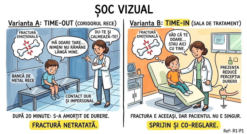 Imagineaza-ti o sectie de Urgente. Un copil de 4 ani vine cu o "fractura emotionala" β durere intensa, plans, urlete, imposibilitate de a se misca rational. Varianta A (Time-Out β Coridorul Rece): doctorul decide ca pacientul e "prea agitat" si il trimite pe coridor: "Du-te si calmeaza-te, si cand esti linistit, revino." Copilul sta singur pe o banca de metal rece, cu fractura netratata, plangand, asteptand sa-i treaca singur. Dupa 20 de minute nu se mai plange β nu pentru ca s-a vindecat, ci pentru ca a amorTit de durere. Varianta B (Time-In β Sala de Tratament): doctorul il tine in sala, langa el, cu mana pe umAr: "Vad ca te doare foarte tare. Stau aici cu tine. Hai sa respiram impreuna." Fractura e aceeasi, durerea e aceeasi β dar pacientul nu e singur. Si prezenta doctorului (firul de pamant, p17) reduce percepTia durerii. Mama Geta era doctorul de pe coridor ani de zile. "Du-te in camera ta!" β si copilul invata ca "cand ma doare cel mai tare, nimeni nu ramane langa mine." Senzatia bancii de metal rece sub coapsele copilului β acel contact dur si impersonal β era tot ce mai simtea dupa ce plansul se oprea.