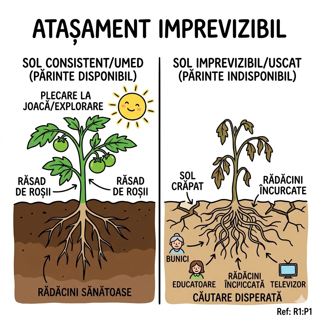 π₯ Ringul Comparatiilor: "Baza Sigura" in atasament functioneaza exact ca solul intr-o gradina: nu solul "face" planta sa creasca β planta creste singura. Solul ofera doar conditiile (umiditate constanta, nutrienti, stabilitate) care permit cresterea. La fel, parintele nu "face" copilul curajos, destept sau rezistent. Parintele ofera conditiile (prezenta predictibila, caldura la intoarcere, raspuns la nevoile emotionale) care permit copilului sa-si dezvolte singur aceste calitati. Diferenta critica: o gradina cu sol uscat nu produce plante "incapabile" β produce plante cu radacini incalcite care folosesc toata energia incercand sa gaseasca apa, in loc sa creasca spre soare. La fel, un copil fara Baza Sigura nu este "rauvoitor" sau "dificil" β este un copil care foloseste toata energia cautand siguranta, in loc sa exploreze lumea.