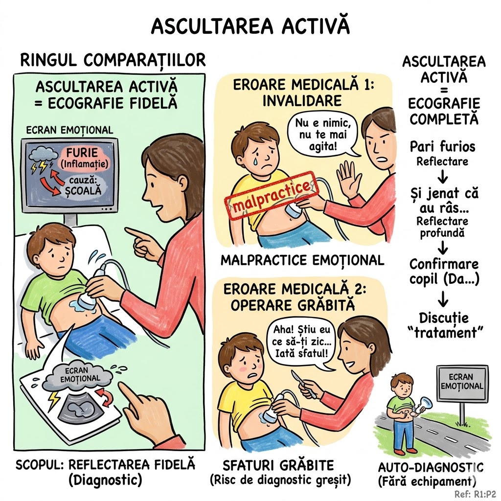 π₯ Ringul Comparatiilor: Ascultarea Activa in relatia cu copilul functioneaza exact ca o ecografie diagnostica: scopul ecografiei nu este sa "repare" ce vede, ci sa reflecteze o imagine clara a ceea ce exista inauntru: "Am gasit o inflamatie la nivelul emotiei de furie, probabil cauzata de un eveniment la scoala." Un ecografist care ar vedea ceva pe ecran si ar spune "Nu e nimic, nu te mai agita!" (invalidare) nu face diagnostic β face malpractice. Un ecografist care ar incepe sa opereze INAINTE de a fi facut ecografia completa (se repede cu sfaturi inainte de a fi ascultat tot) face o eroare medicala. Ascultarea Activa = ecografie completa: "Pari foarte furios" (reflectare). "Si jenat ca au ras colegii" (reflectare mai profunda). Abia dupa ce imaginea e completa si pacientul (copilul) confirma ("Da... exact asta simt"), poti discuta "tratamentul". Diferenta: la ecografie, rezultatul gresit afecteaza un diagnostic. In familie, "ecografia" gresita (a nu reflecta corect sau a sari la solutii) inchide ecranul emotional al copilului permanent β si data viitoare cand il doare, nu va mai veni la tine cu sonda, ci va incerca sa-si faca auto-diagnosticul singur, fara echipament.
